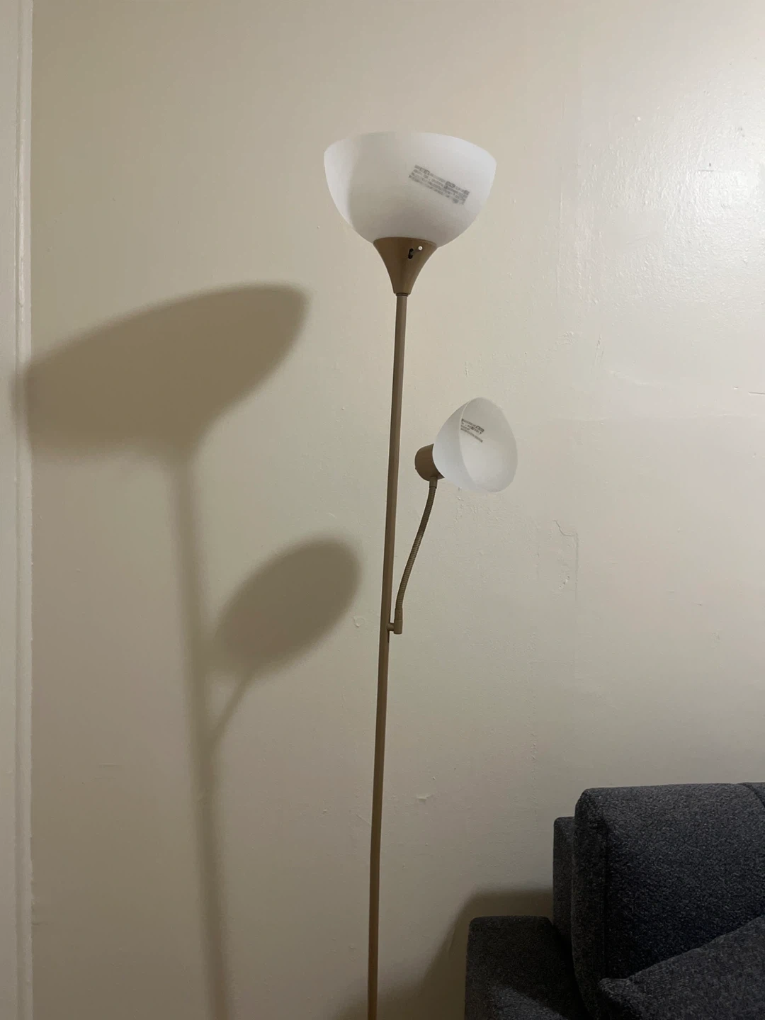 This is a floor lamp with a reading light. It's in good condition and ready to brighten up your space! There is one bulb in the main light but the other space is empty. It’s a yellow light bulb.