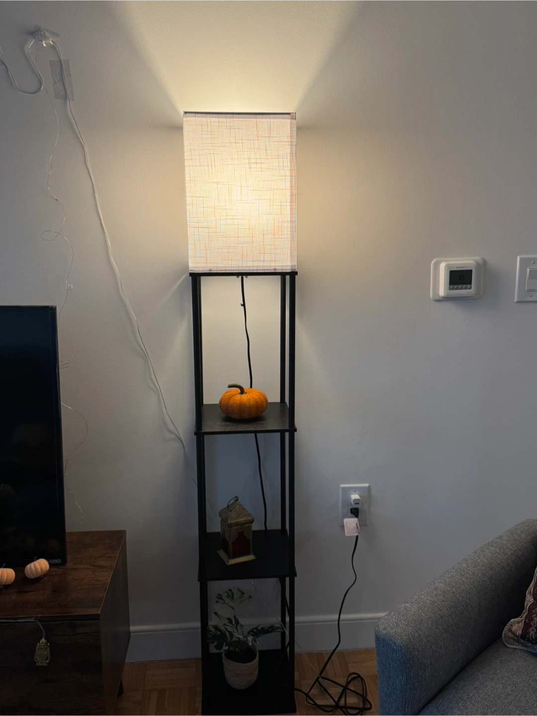 18This floor lamp features a square shade and built-in shelves, perfect for adding light and storage to any room! It has a black metal frame and a neutral-colored shade that complements various decor styles Selling one for $27 or two for $50 with bulbs