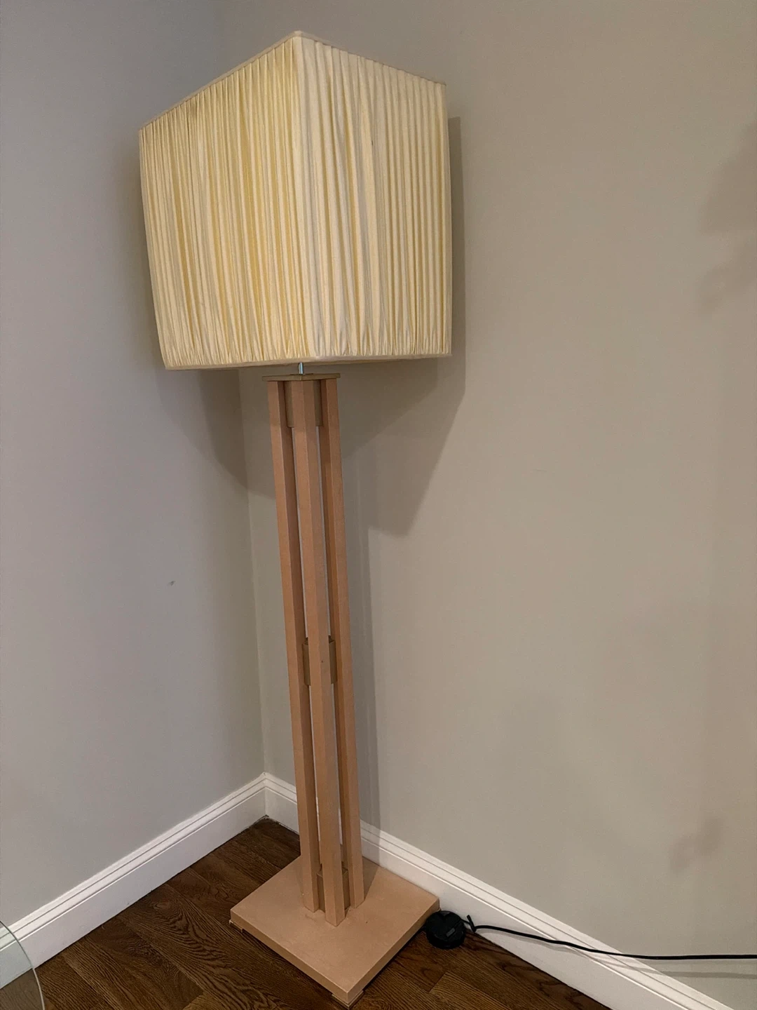 60Selling a floor lamp with a square shade! It has a light wood base and a cream-colored, pleated shade. It would look great in a living room or bedroom