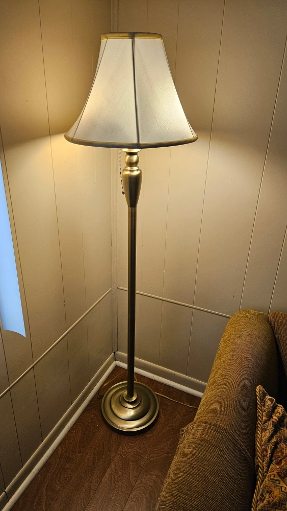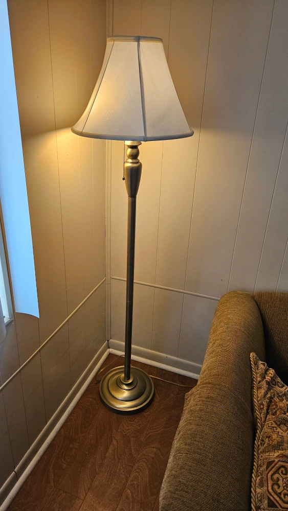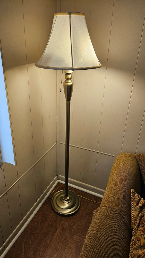 A classic floor lamp. The base is round. Includes a white shade. A lovely addition to any space, great for reading in your favorite chair.