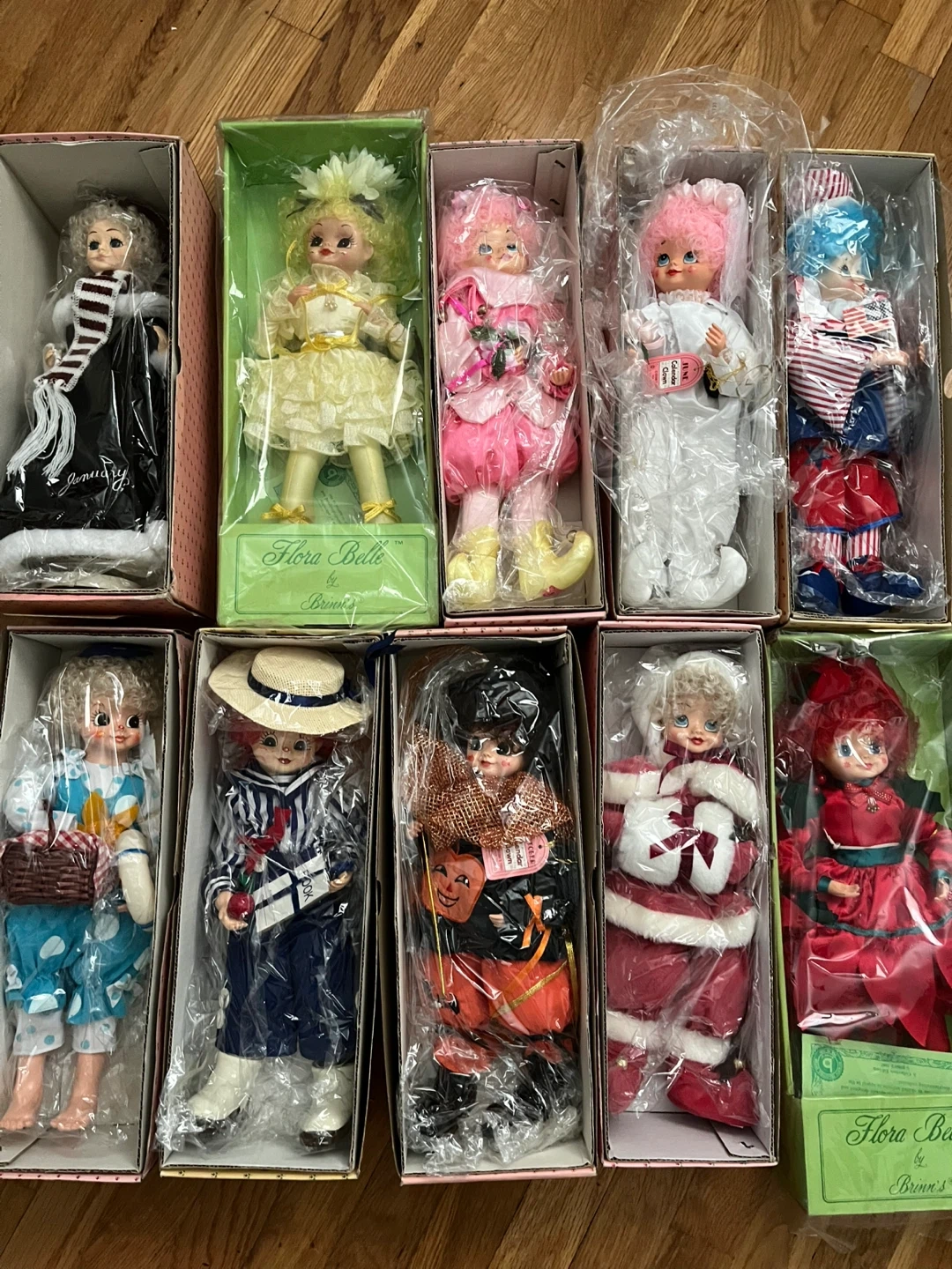 Selling a collection of Flora Belle by Brinn's dolls, each with unique designs and outfits! They are all still in their original boxes and packaging. Perfect for collectors or anyone who appreciates vintage dolls