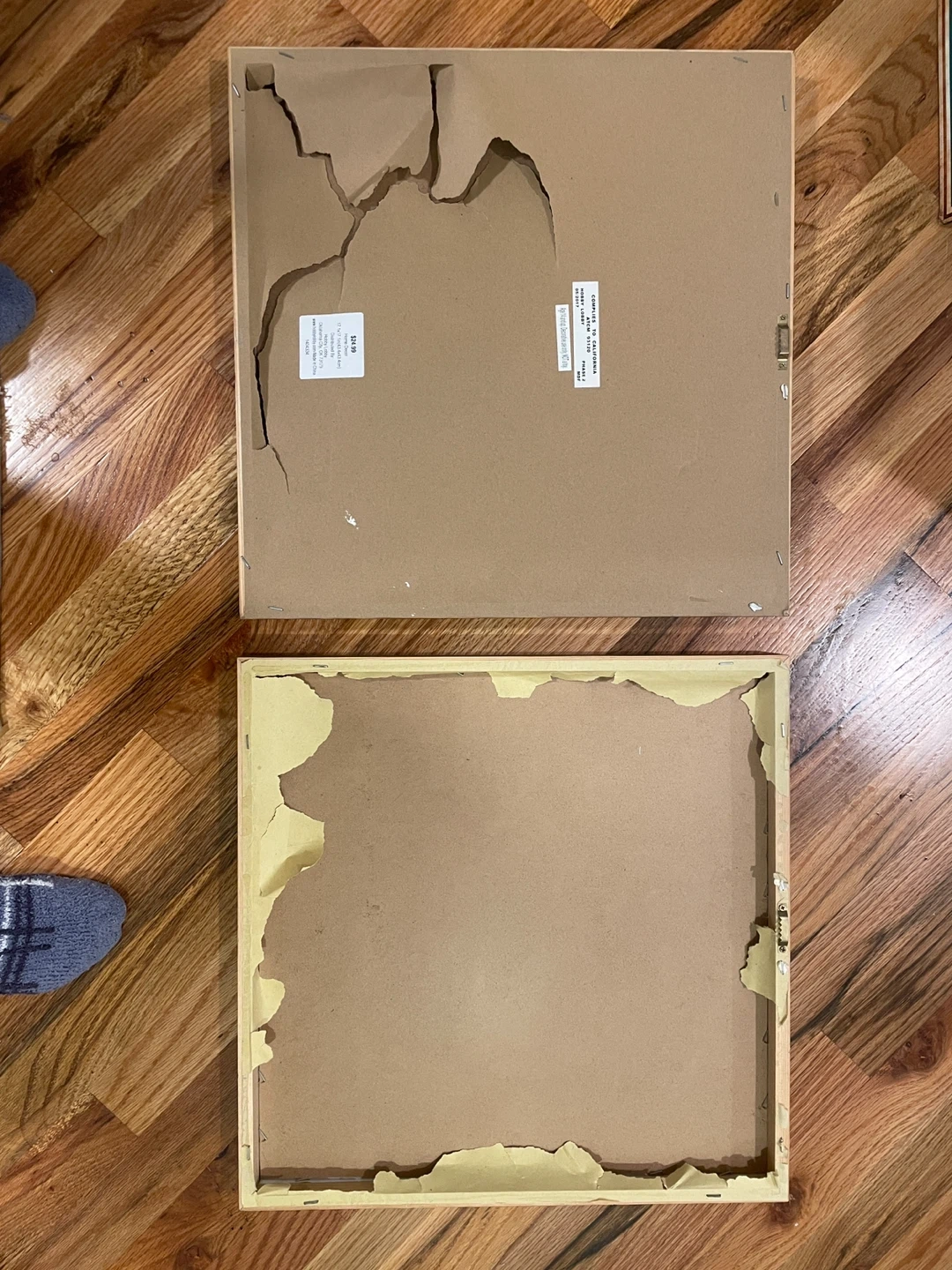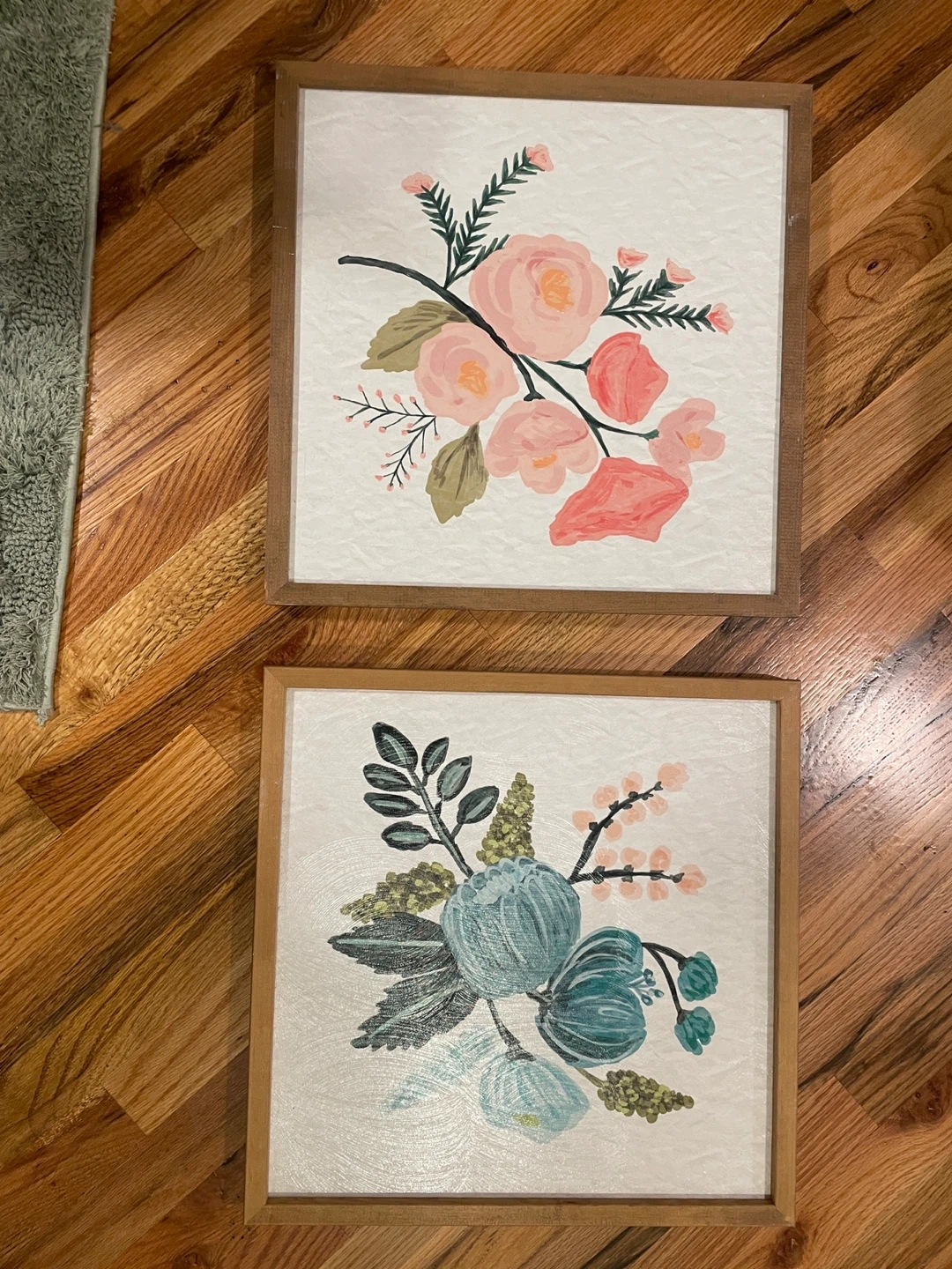 652-piece wall art. Pink and blue flowers. 17in x 17in x 1.5in Very good quality. Back paper is ripped off on one, but it does not affect the quality or appearance of the art when hung up. Pick up only.