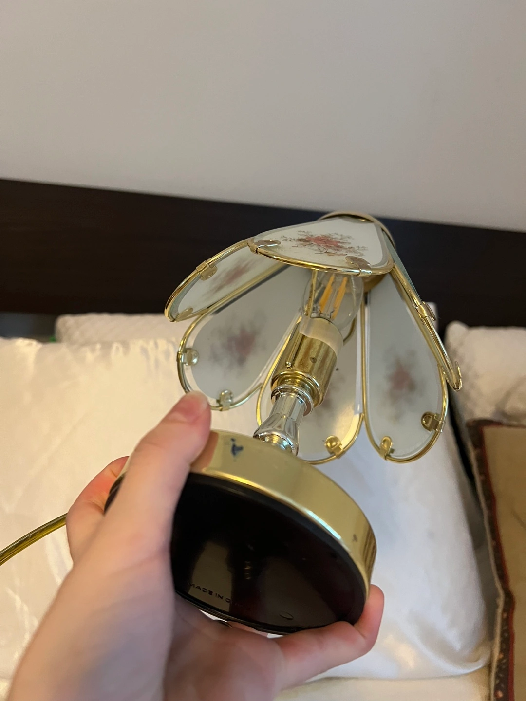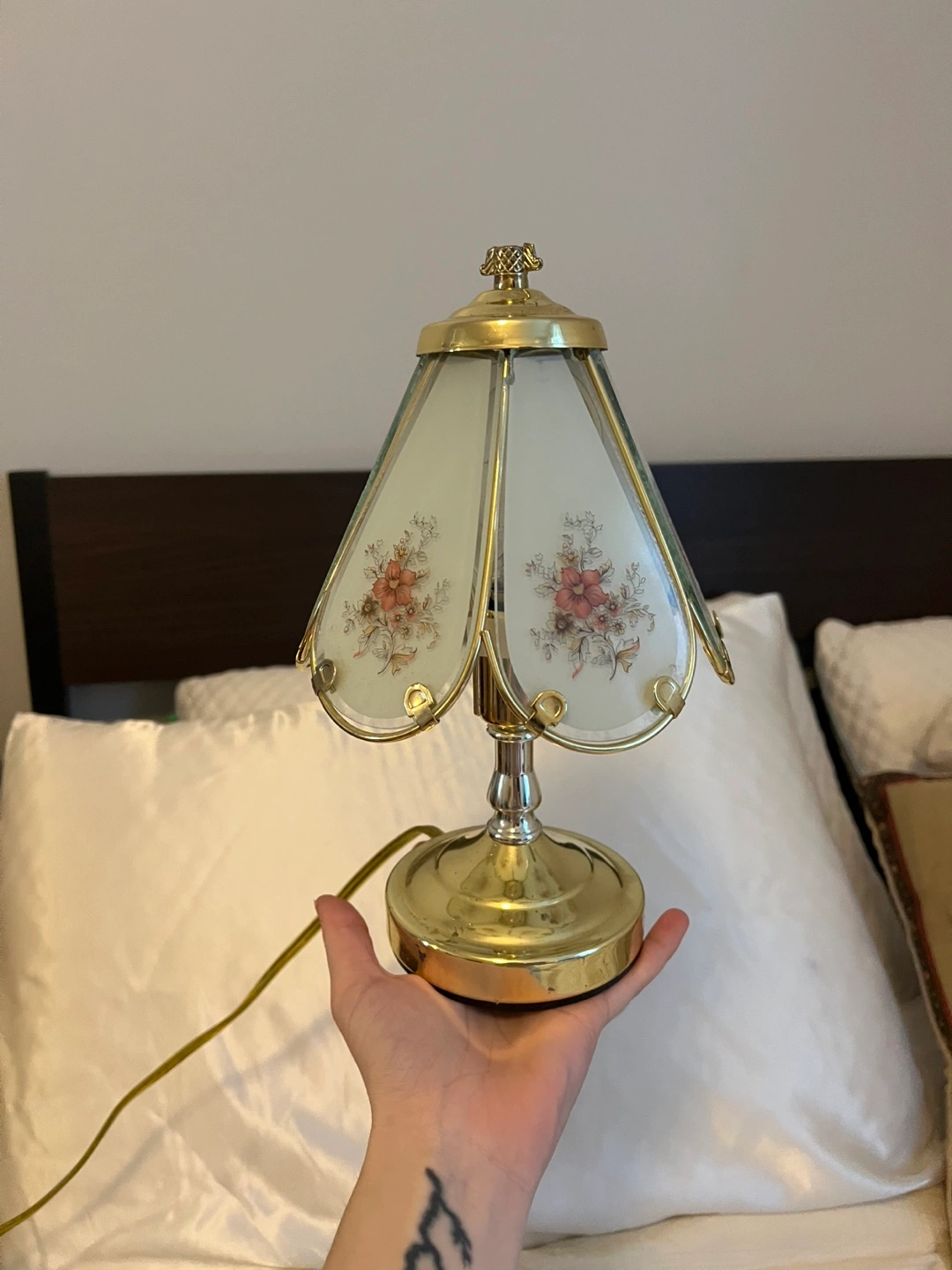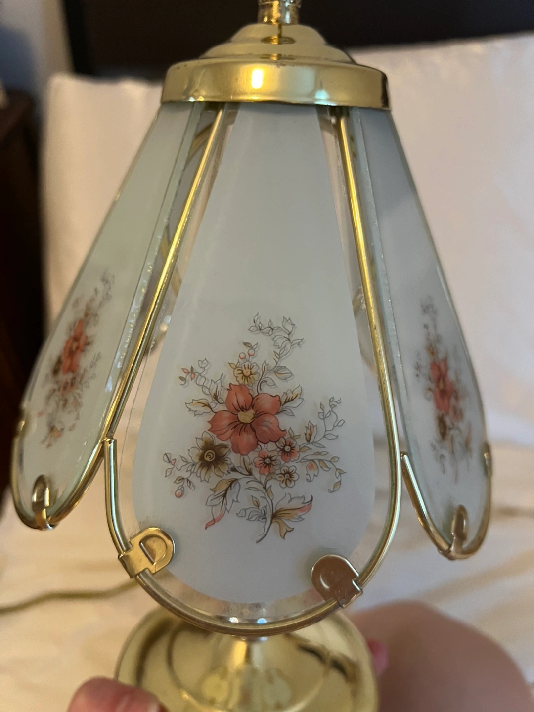 Selling a cute floral accent table lamp! It features a gold-tone base and a frosted glass shade with a delicate floral design. Perfect for adding a touch of vintage charm to any room. Bought for $75.