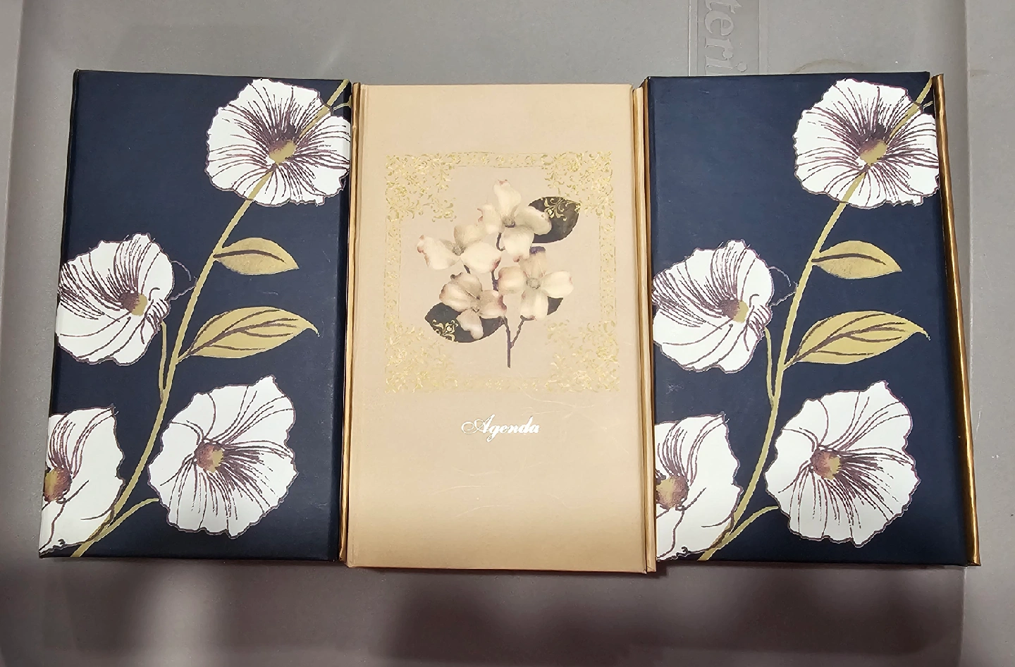 15I'm selling a set of three agenda/note pads: an address book, an agenda, and a note book; all in one. They all feature a beautiful floral design and have a magnetic closure. Perfect for staying organized in style!