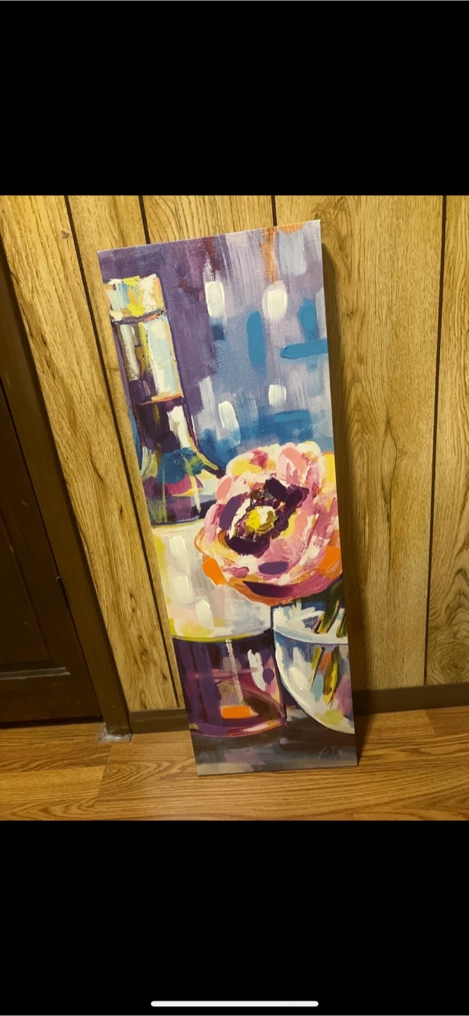 A vibrant painting featuring a floral arrangement and a wine bottle. The colors are bright and cheerful, perfect for adding a touch of art to your space