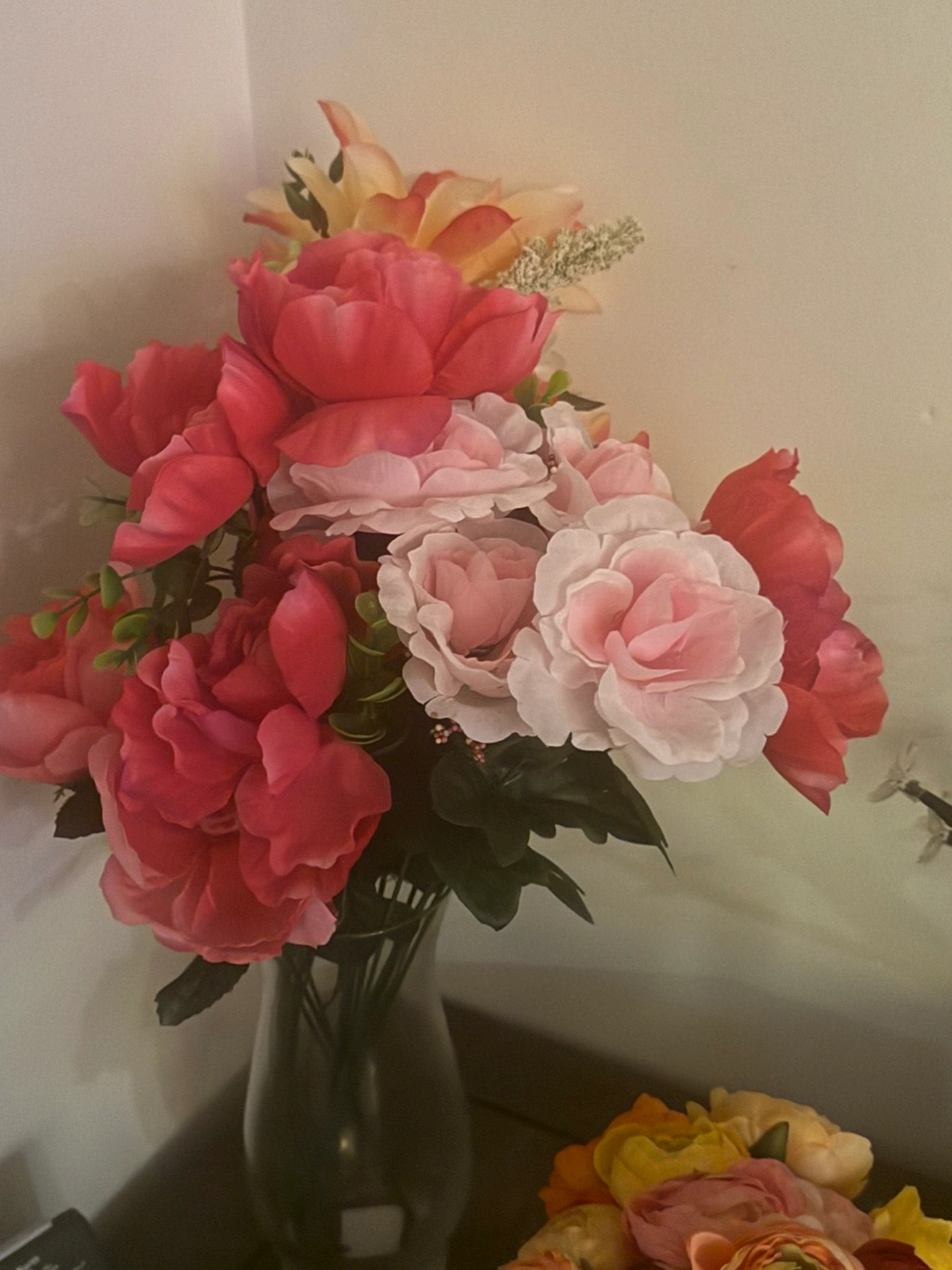 This is a beautiful floral arrangement in a vase. It features a mix of pink and peach flowers, perfect for adding a touch of elegance to any room