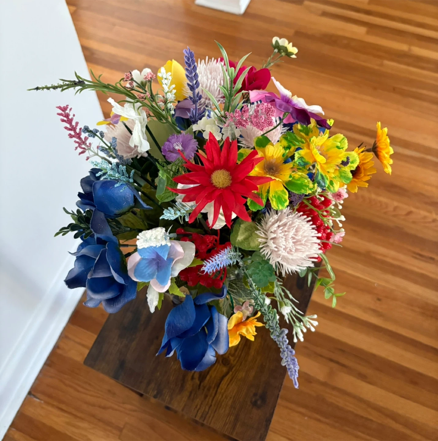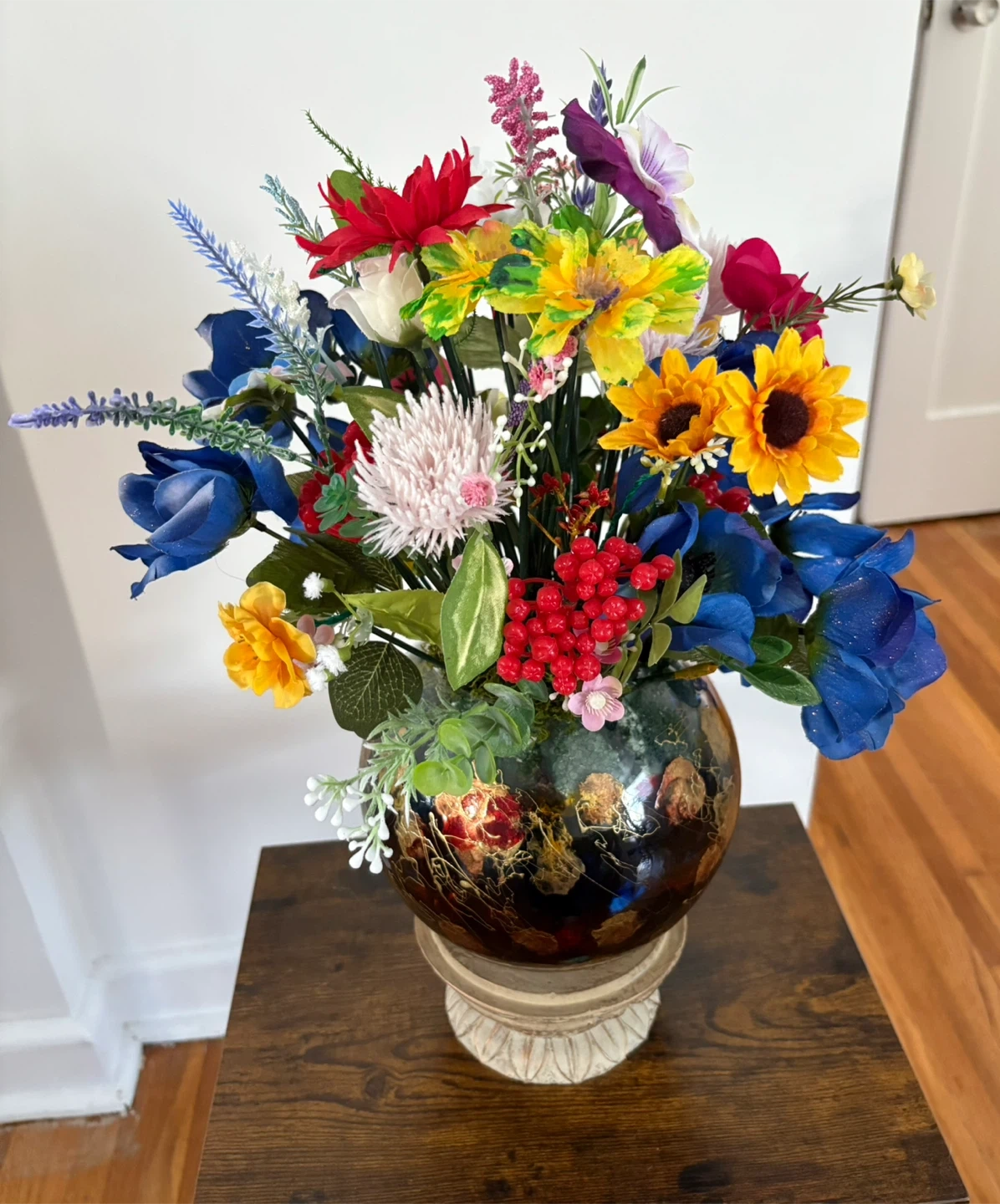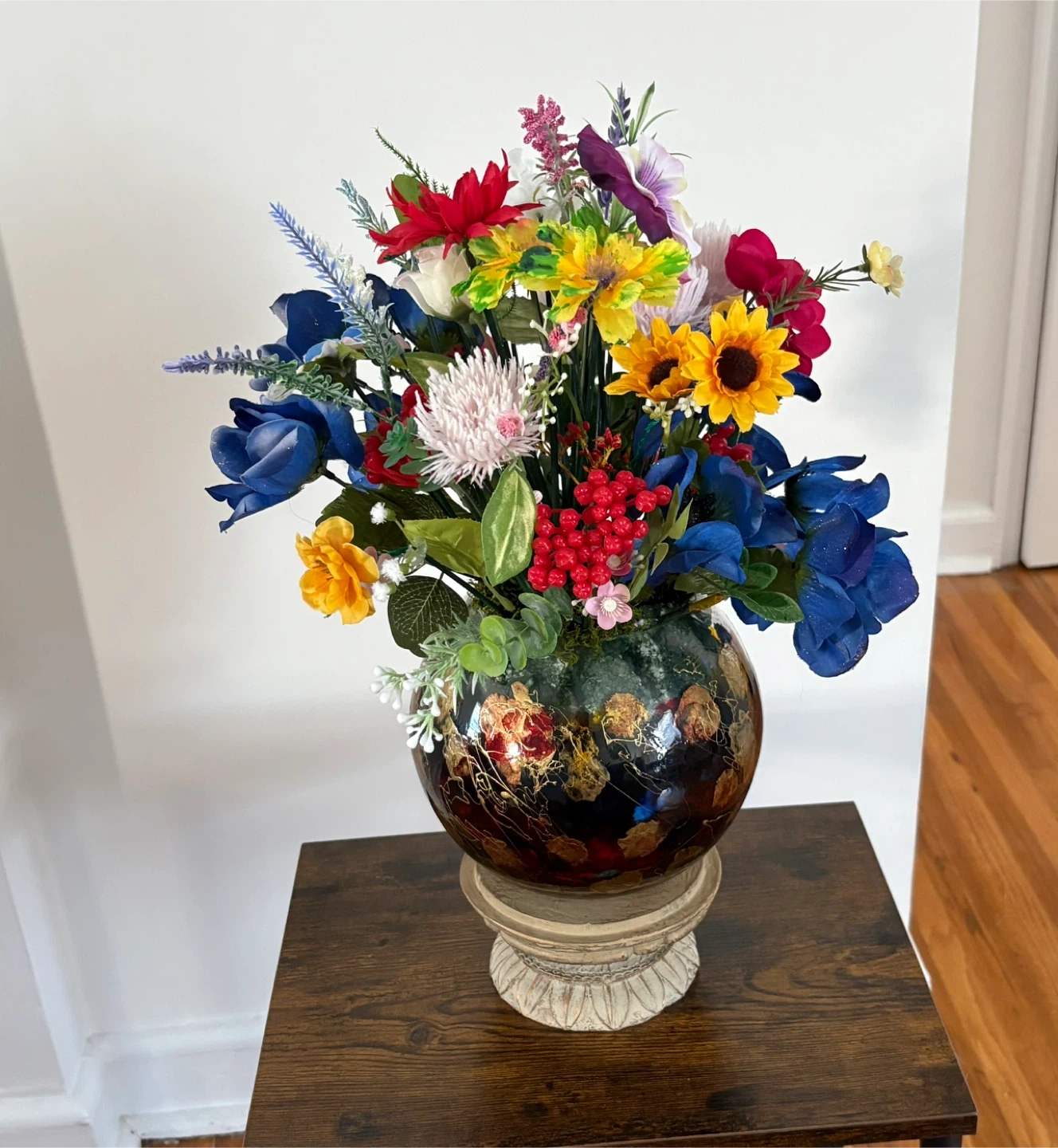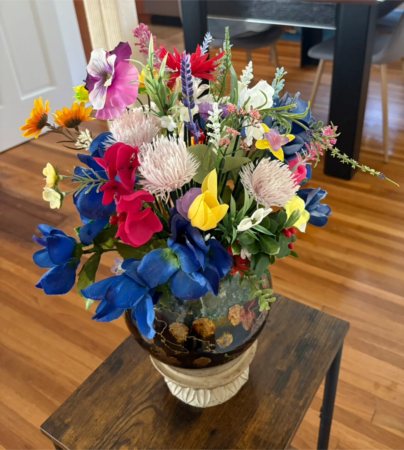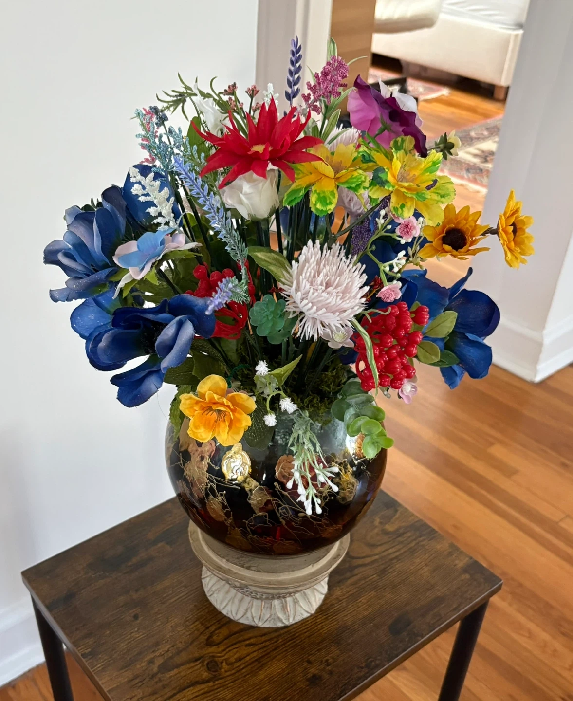 This is a beautiful floral arrangement with a variety of colorful flowers. It comes in a decorative vase with gold accents. It would be a great addition to any room!