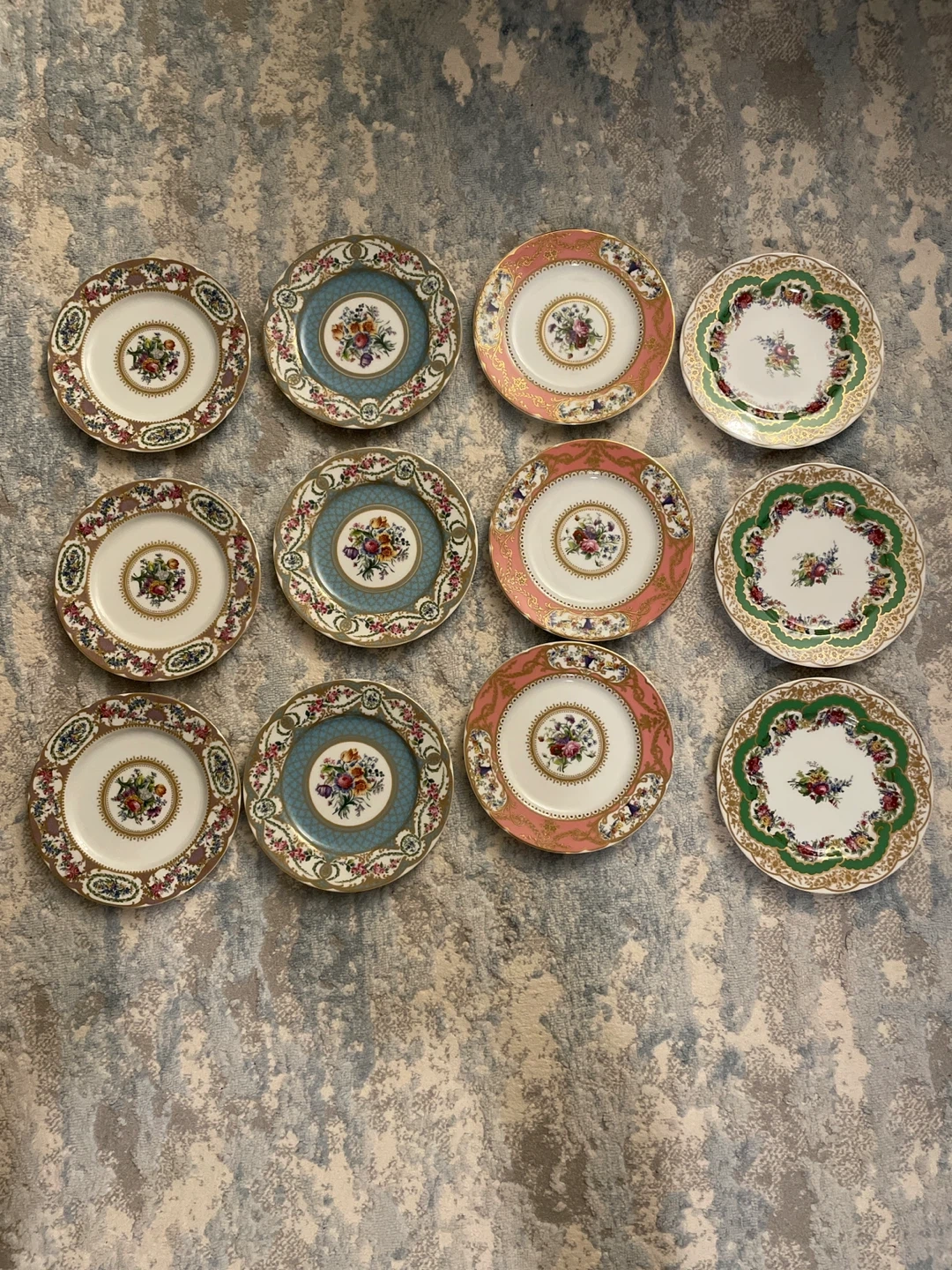 Selling a set of 12 decorative plates with beautiful floral designs. Each plate has a unique floral pattern and color scheme, adding a touch of elegance to any setting. Perfect for display or special occasions! Brand is Andrea by Sadek