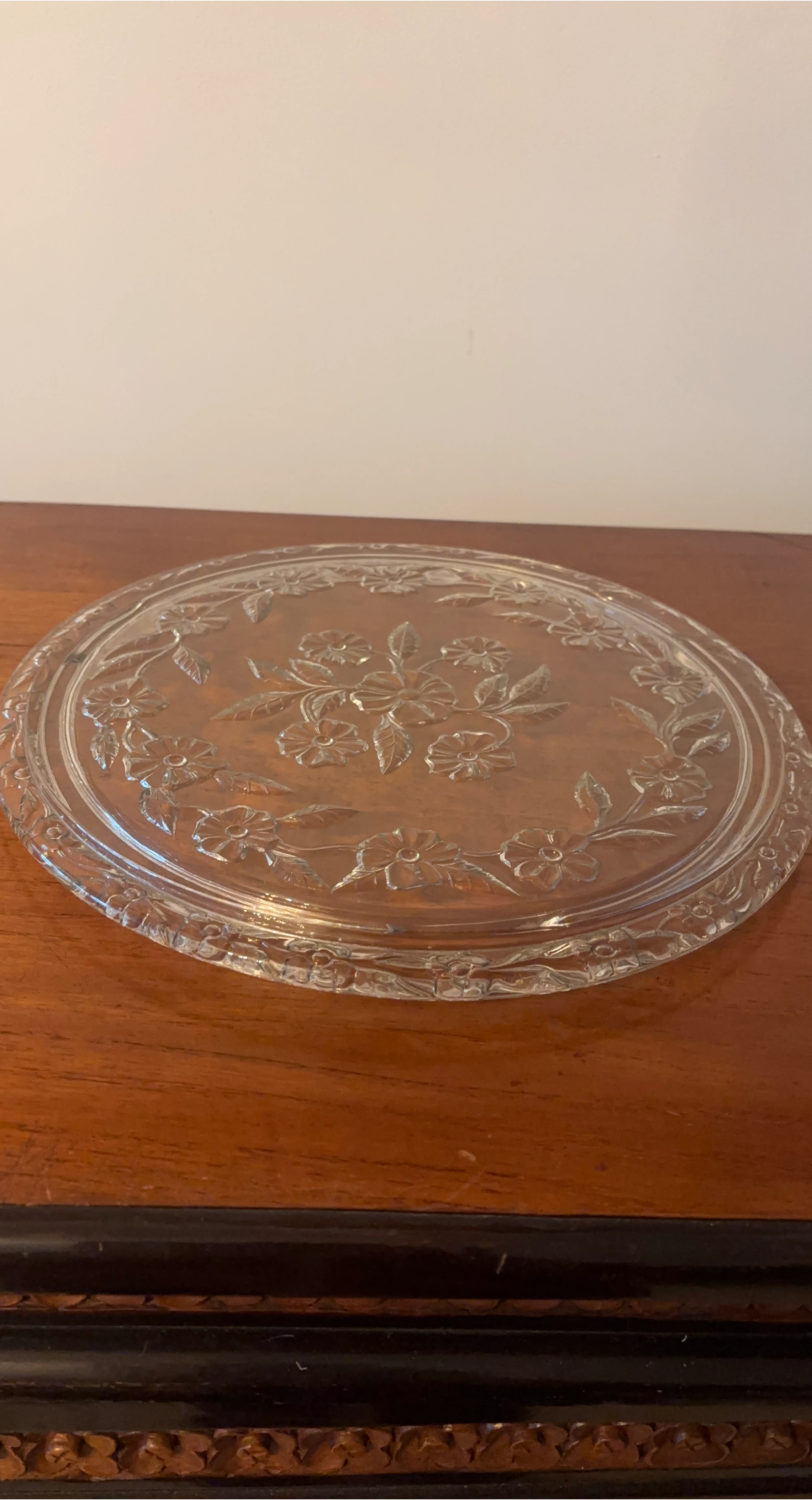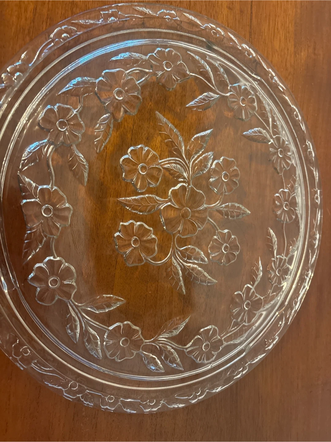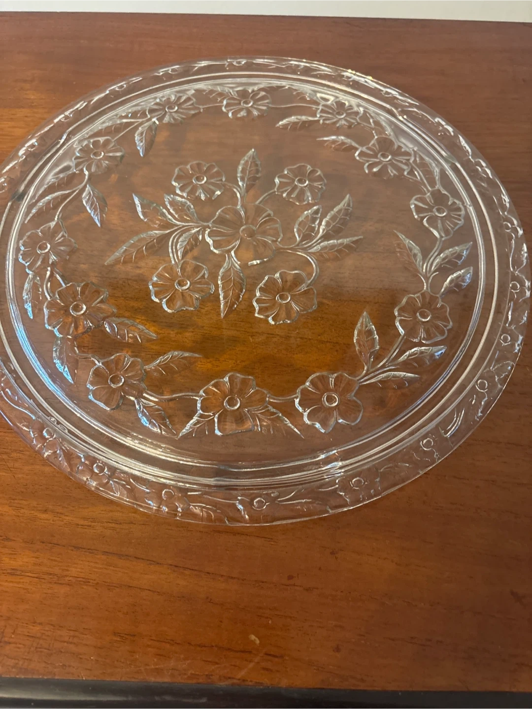 Selling a clear glass cake plate with a pretty floral embossed design. It's perfect for displaying cakes or other desserts. The plate is in great condition!