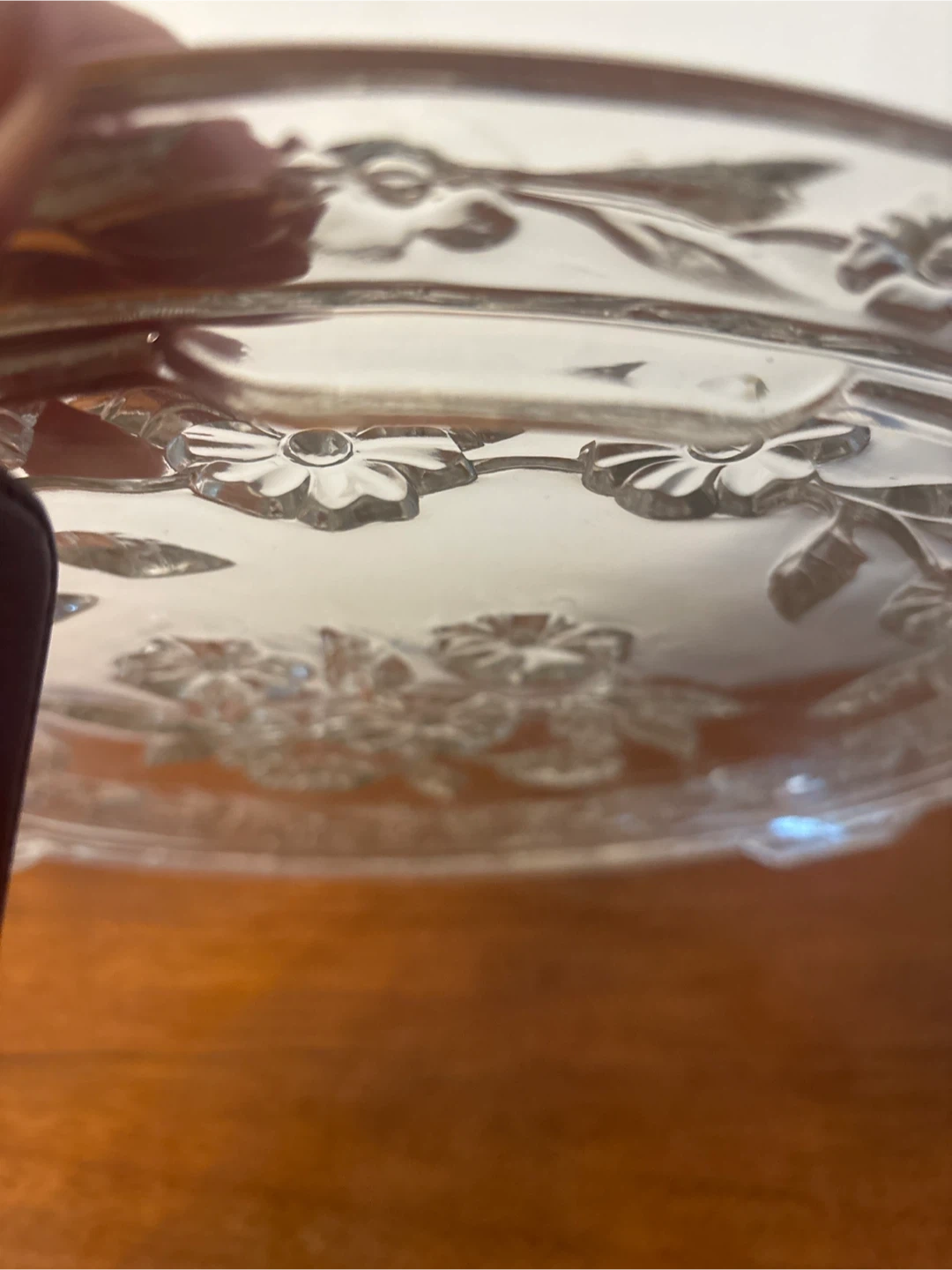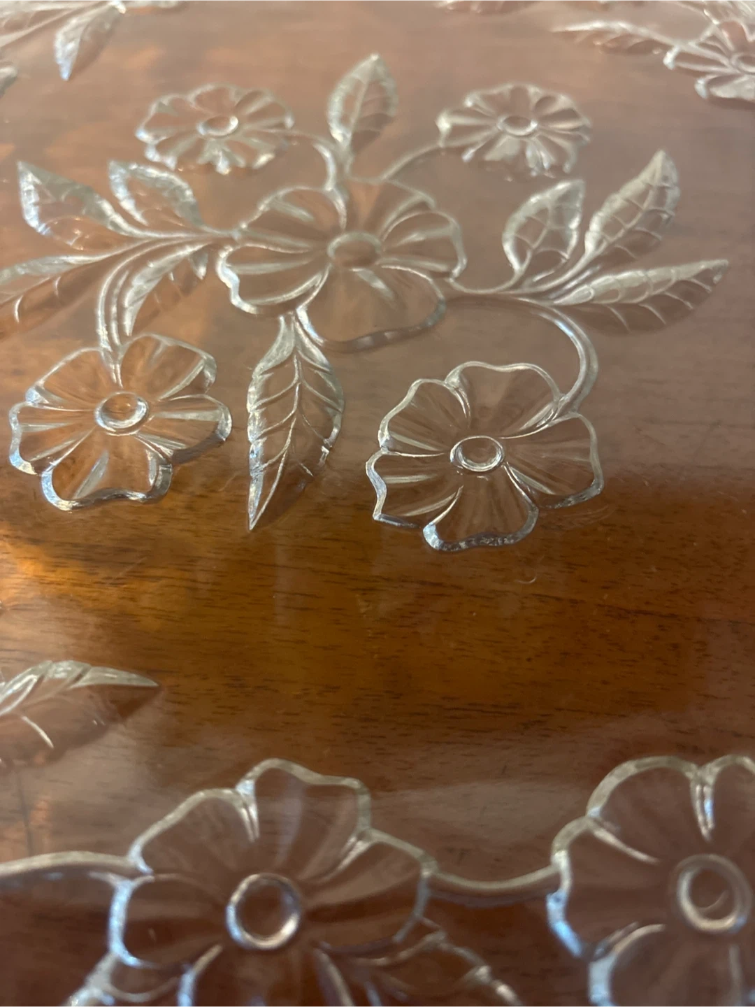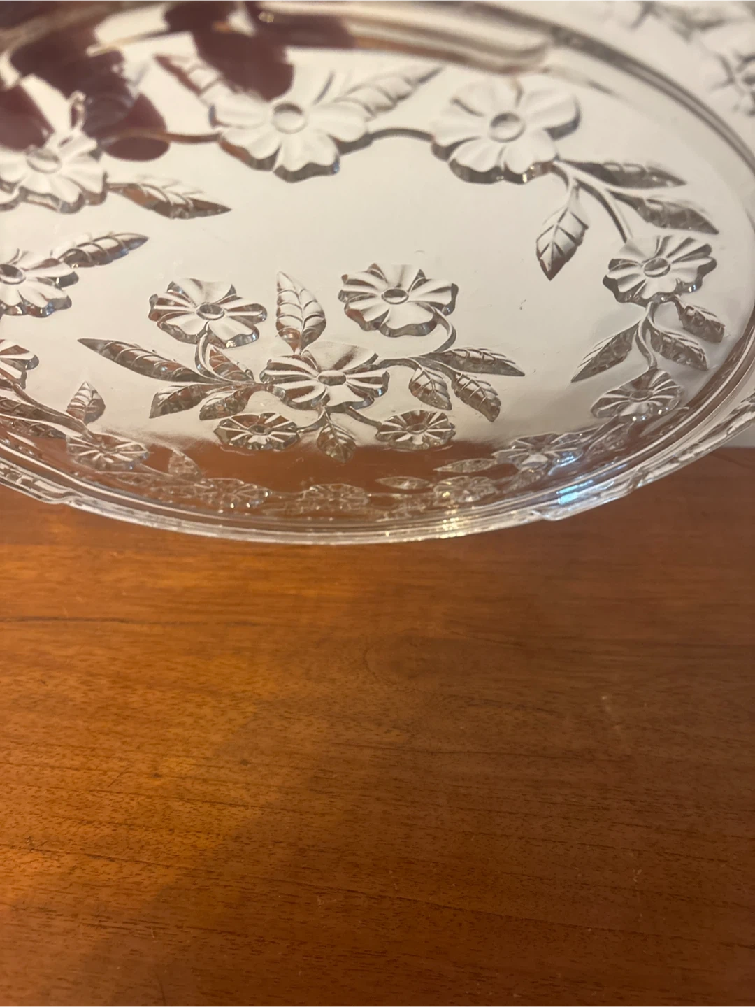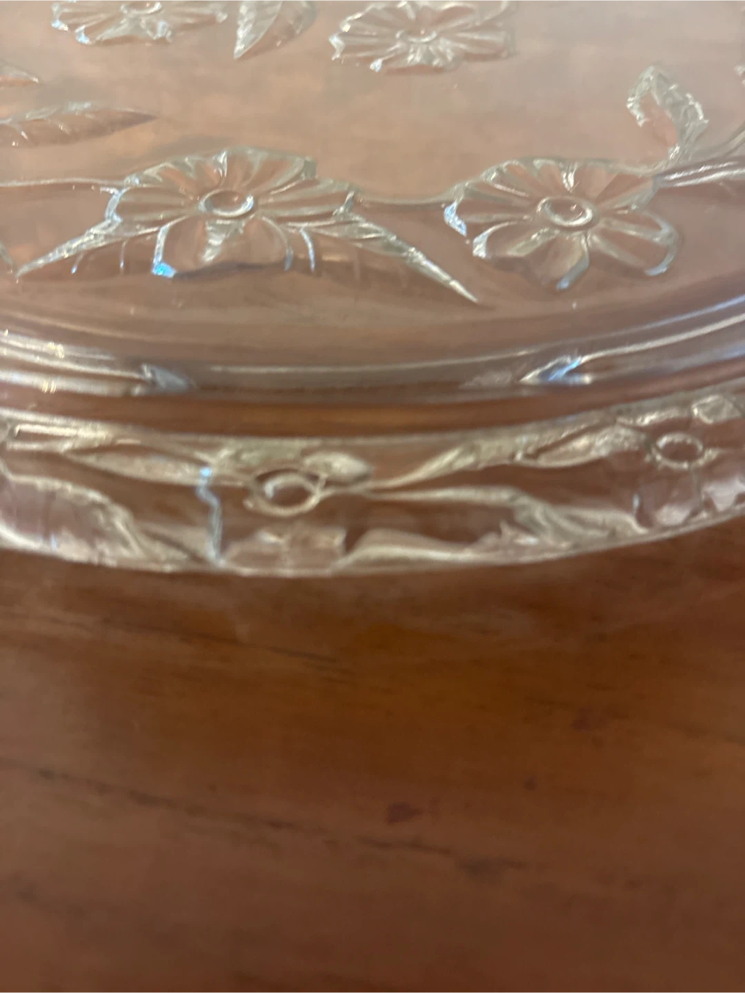 Selling a clear glass cake plate with a pretty floral embossed design. It's perfect for displaying cakes or other desserts. The plate is in great condition!