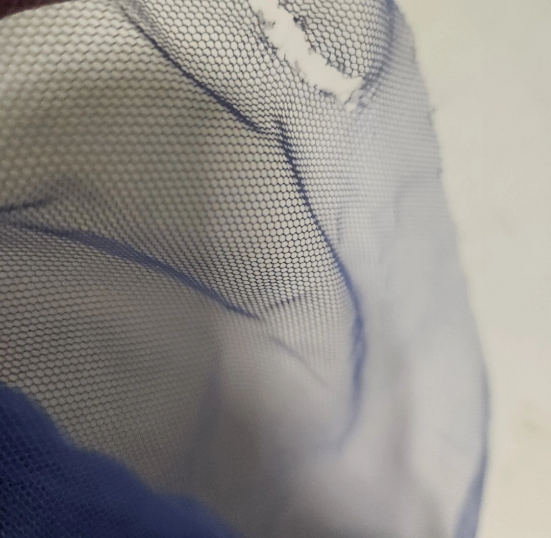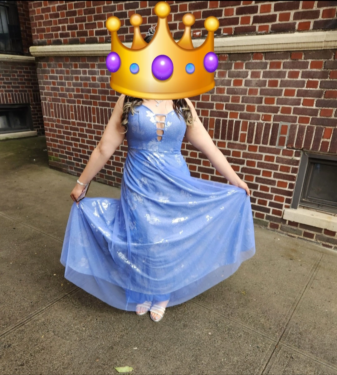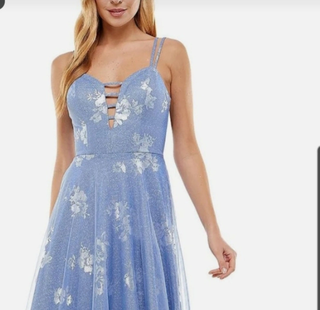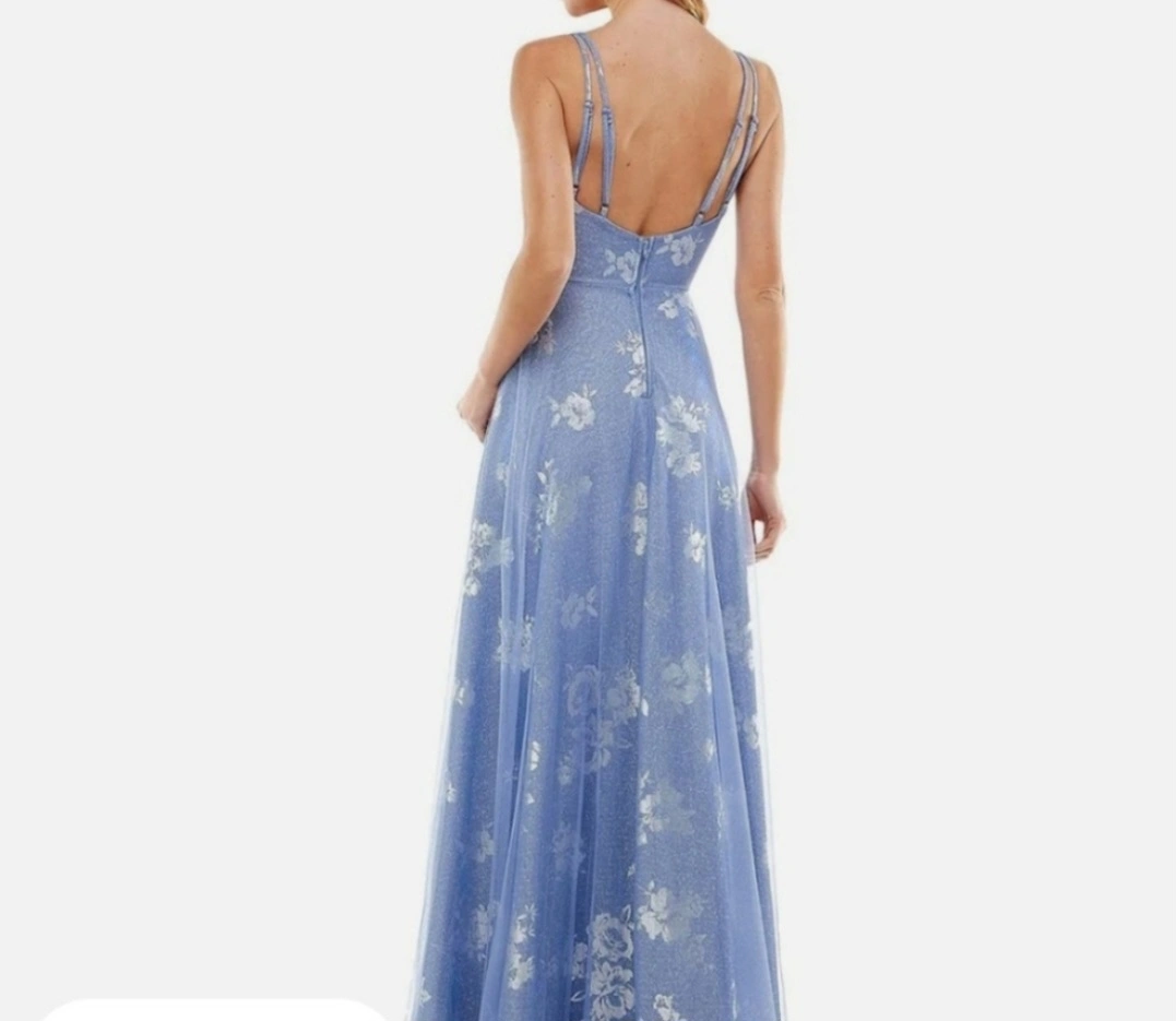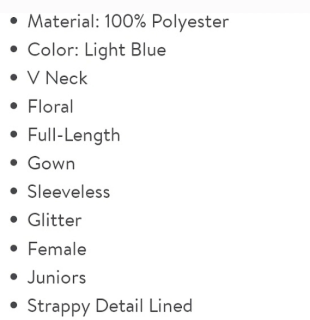 This is a light blue gown with a floral pattern and glitter detailing. It's full-length, sleeveless, and made of 100% polyester. The gown has a V-neck and strappy detail lining. Perfect for juniors! Beautiful Dress Only Worn Once. My daughter is 5'9 weighs 150. She wore flats because dress touched the floor and she wanted to be comfortable. Color is Light Bluish/Periwinkle depending on lighting. Her words when she put in on I feel like Cinderella!! Only imperfection is slight hole in tulle that is not noticeable. See picture. Dress is 3 Layers tulle, dress and slip. Loved that gilter did not fall everywhere.