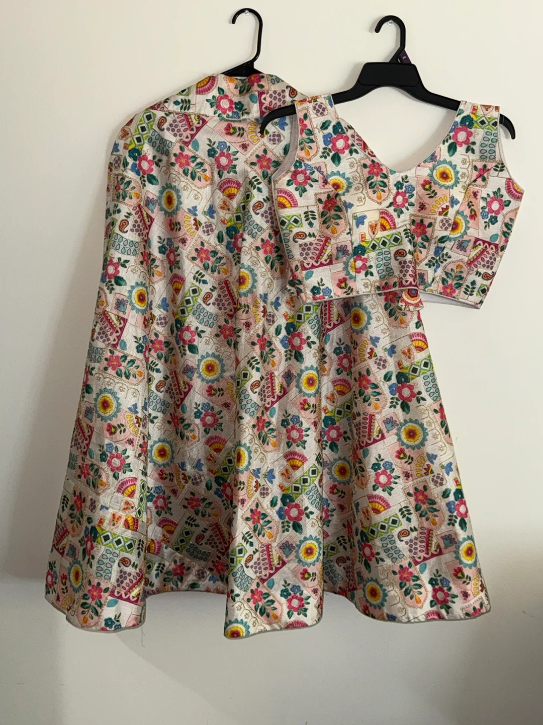 63Here's a beautiful floral lehenga choli set! It features a colorful floral pattern. The set includes a skirt and a matching blouse. Perfect for a special occasion! Chaniya length- 39-40 (long) Blouse - 37 (18.5) It’s not worn even not single time I bought it online but it’s too small for me so had to sell it. There is no dupatta just tow pieces. But selling it only for 45$ plus what ever is shipping charges and if u come in person no charge for shipping
