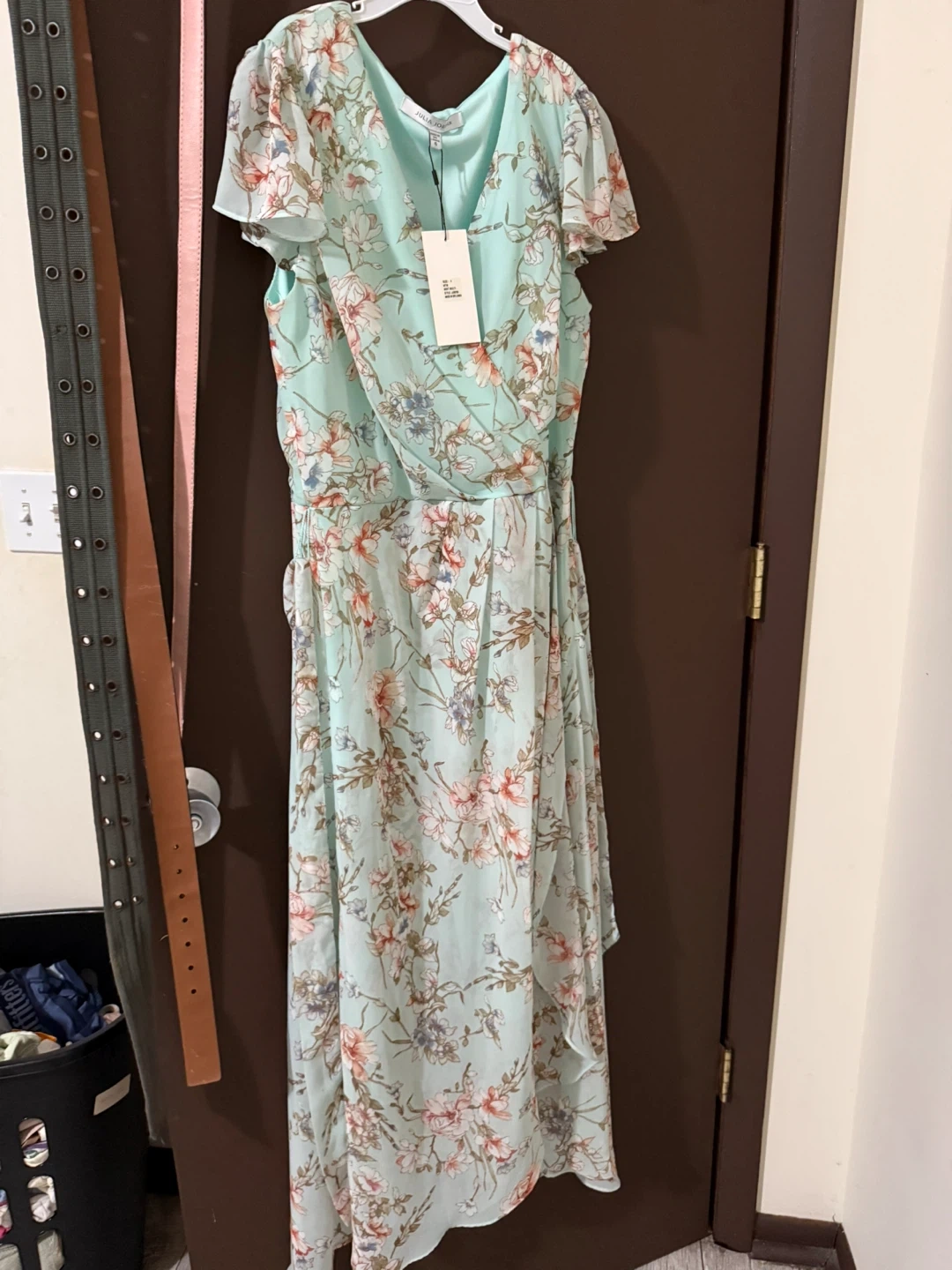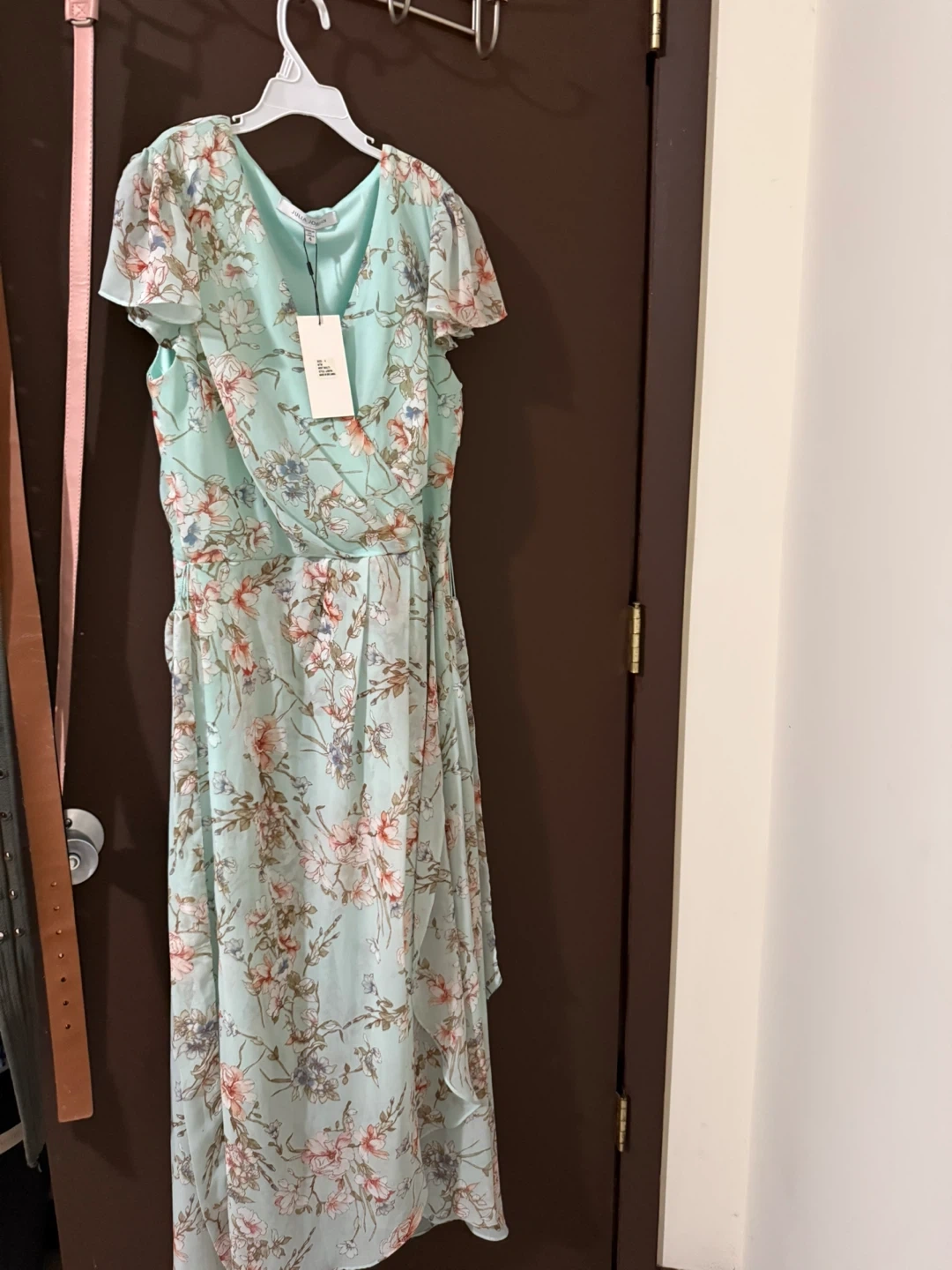 Selling a beautiful floral midi dress, size small. It features a lovely floral pattern on a light blue/green background. Perfect for spring or summer!