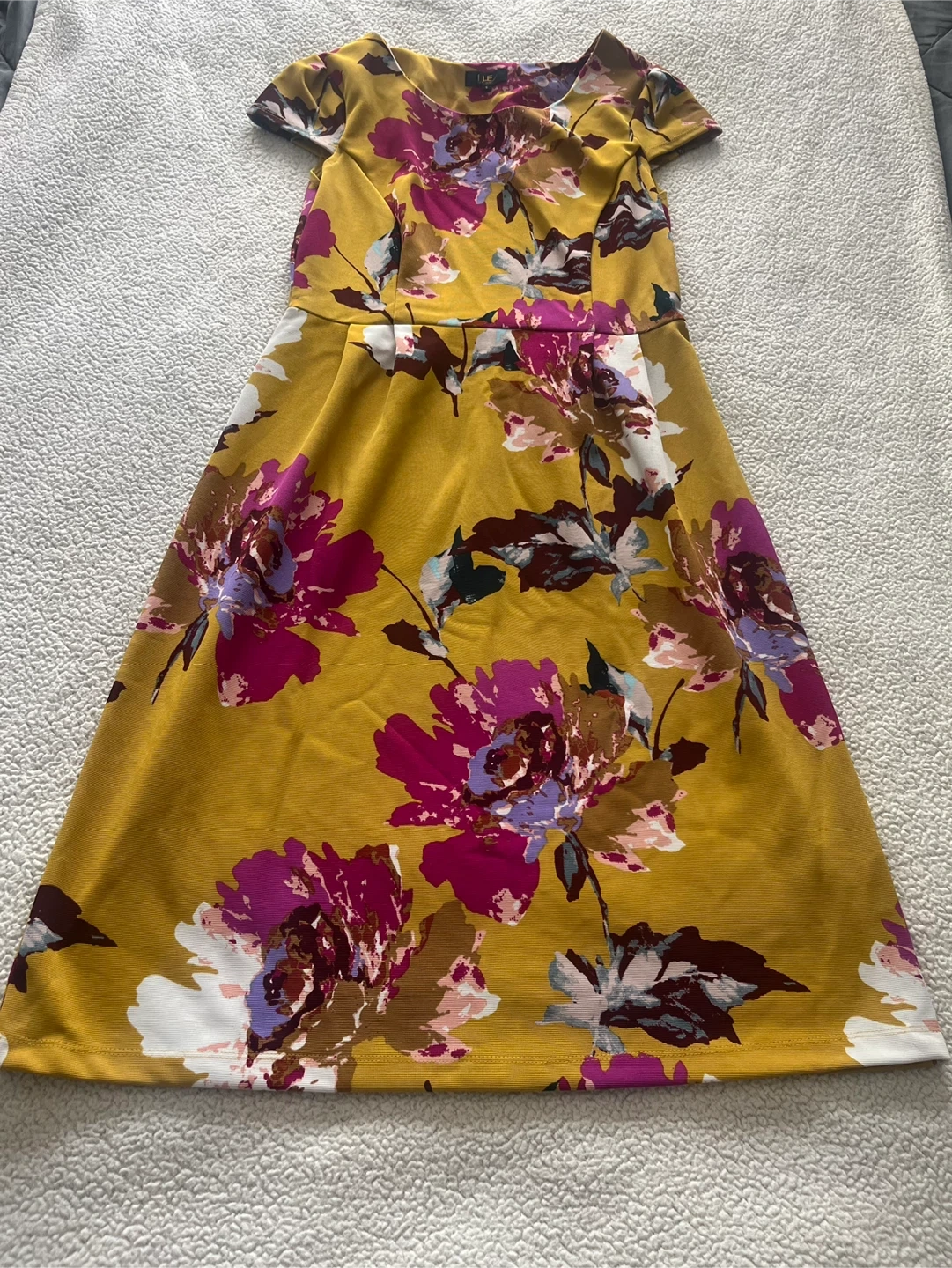 This is a cute floral dress with a mustard yellow background. It would be perfect for spring or summer