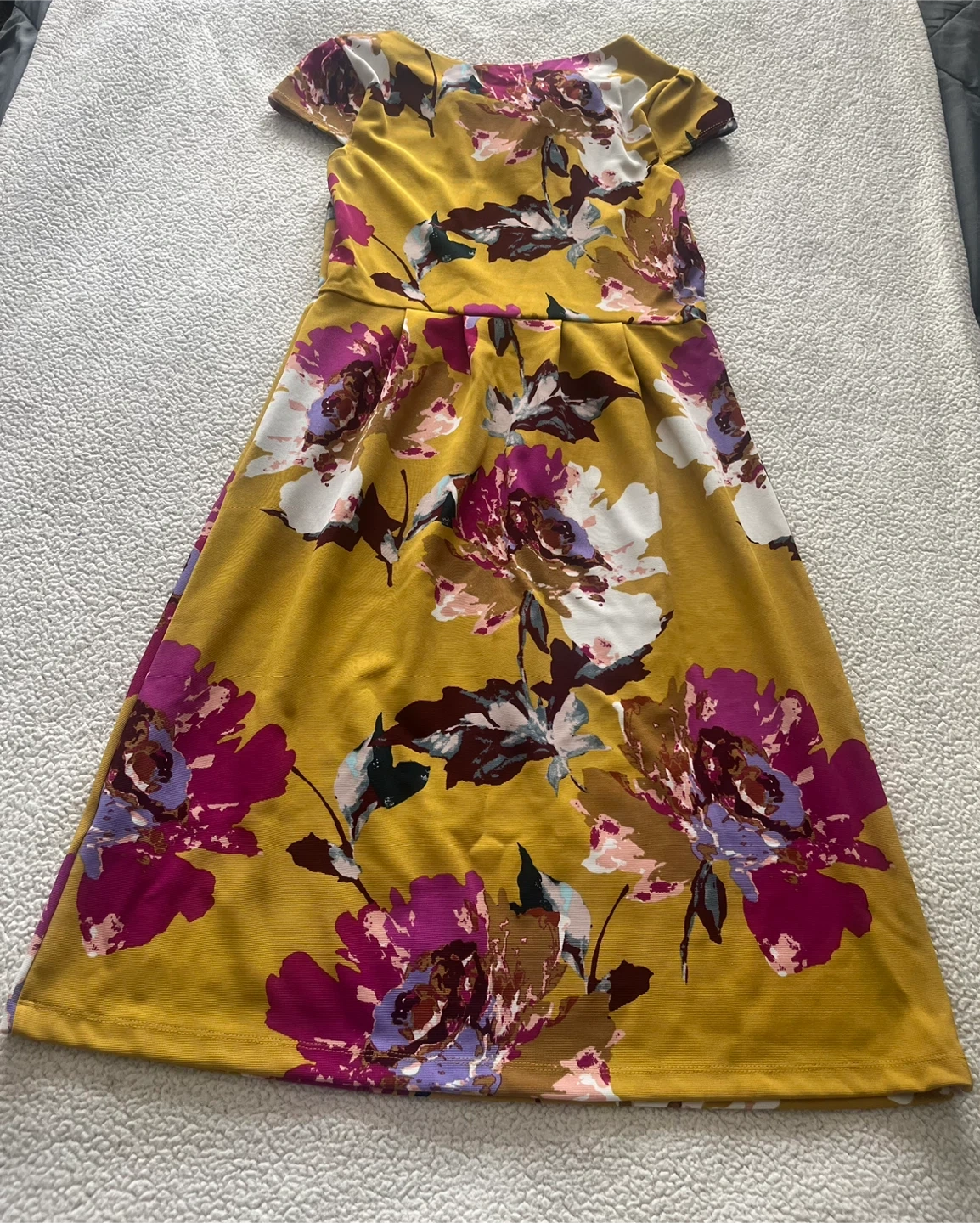 This is a cute floral dress with a mustard yellow background. It would be perfect for spring or summer