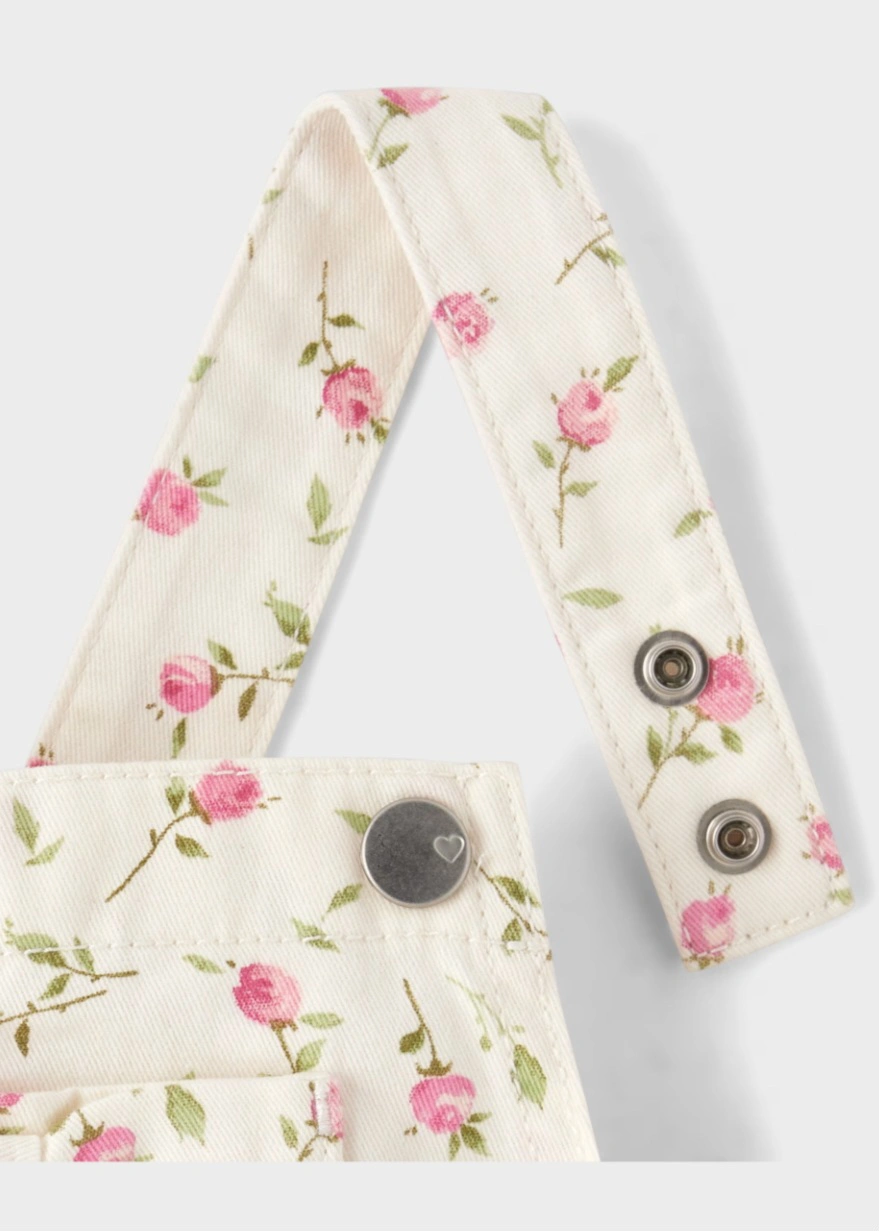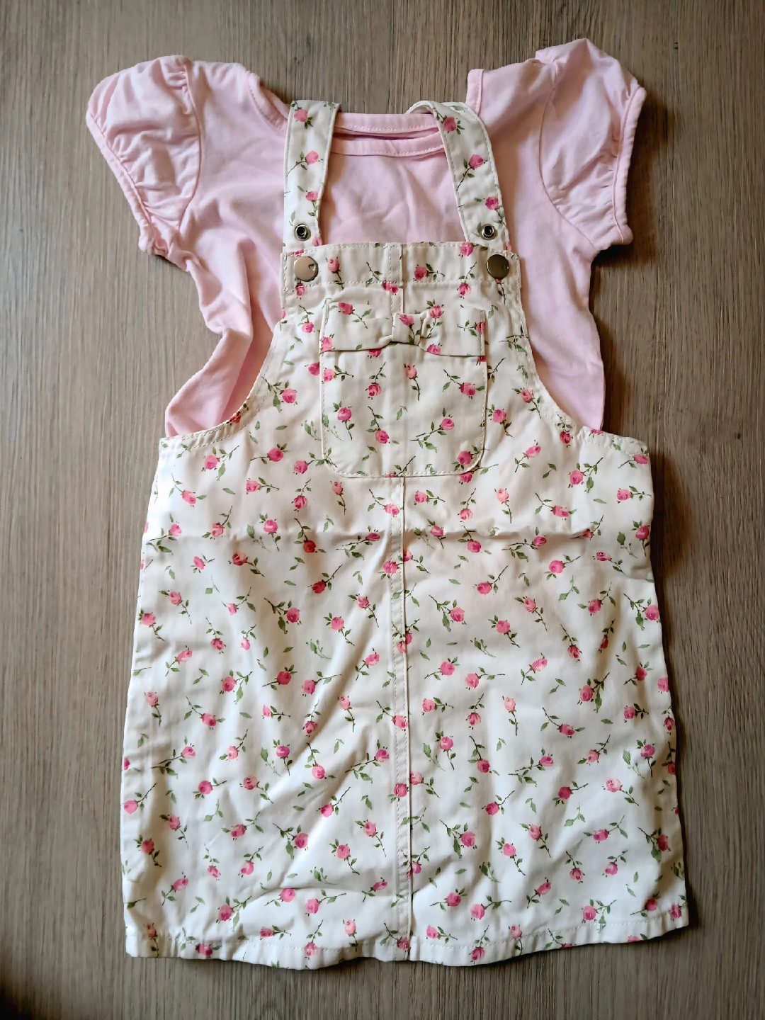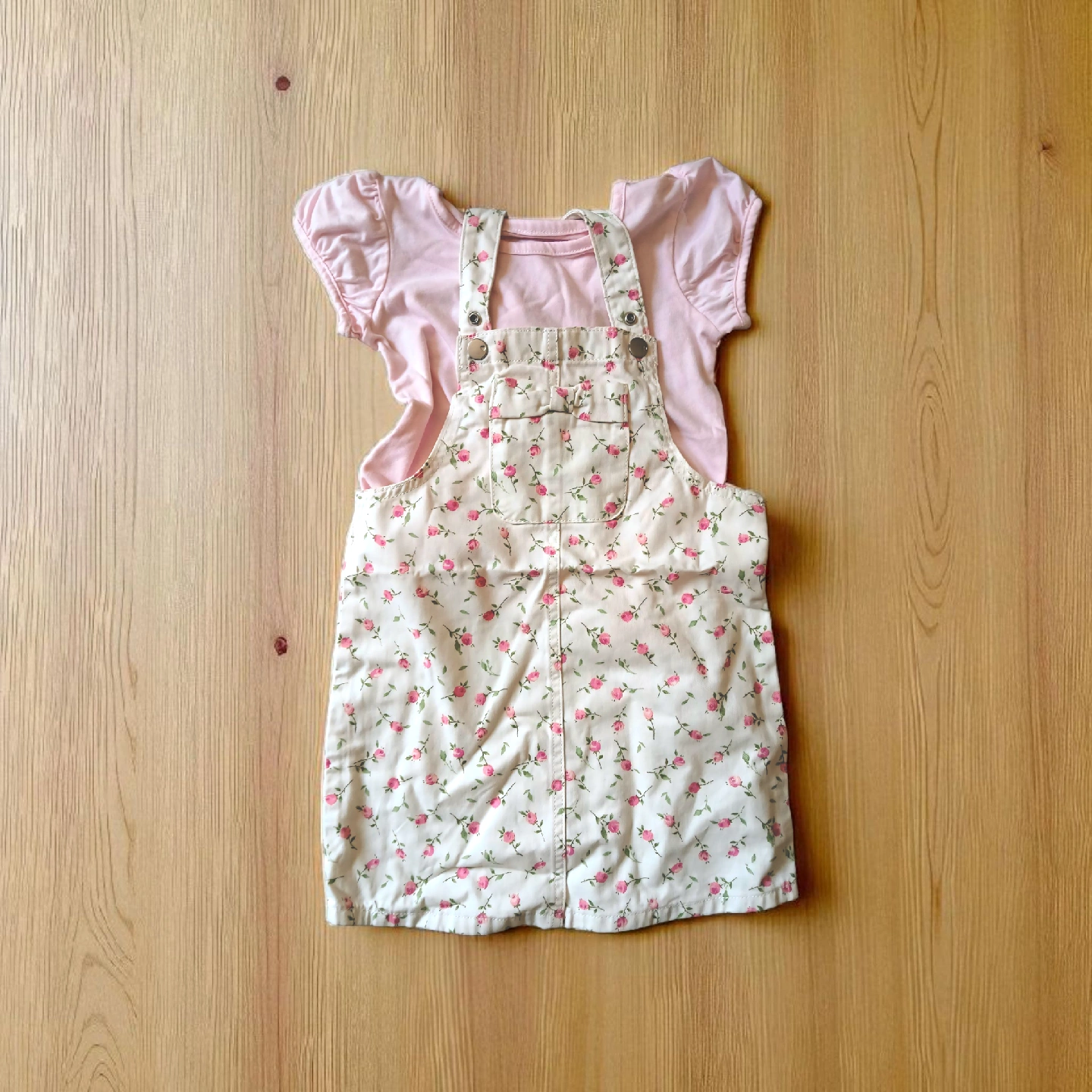65Cute floral overalls dress with a matching pink short-sleeved top. Perfect for your little one!