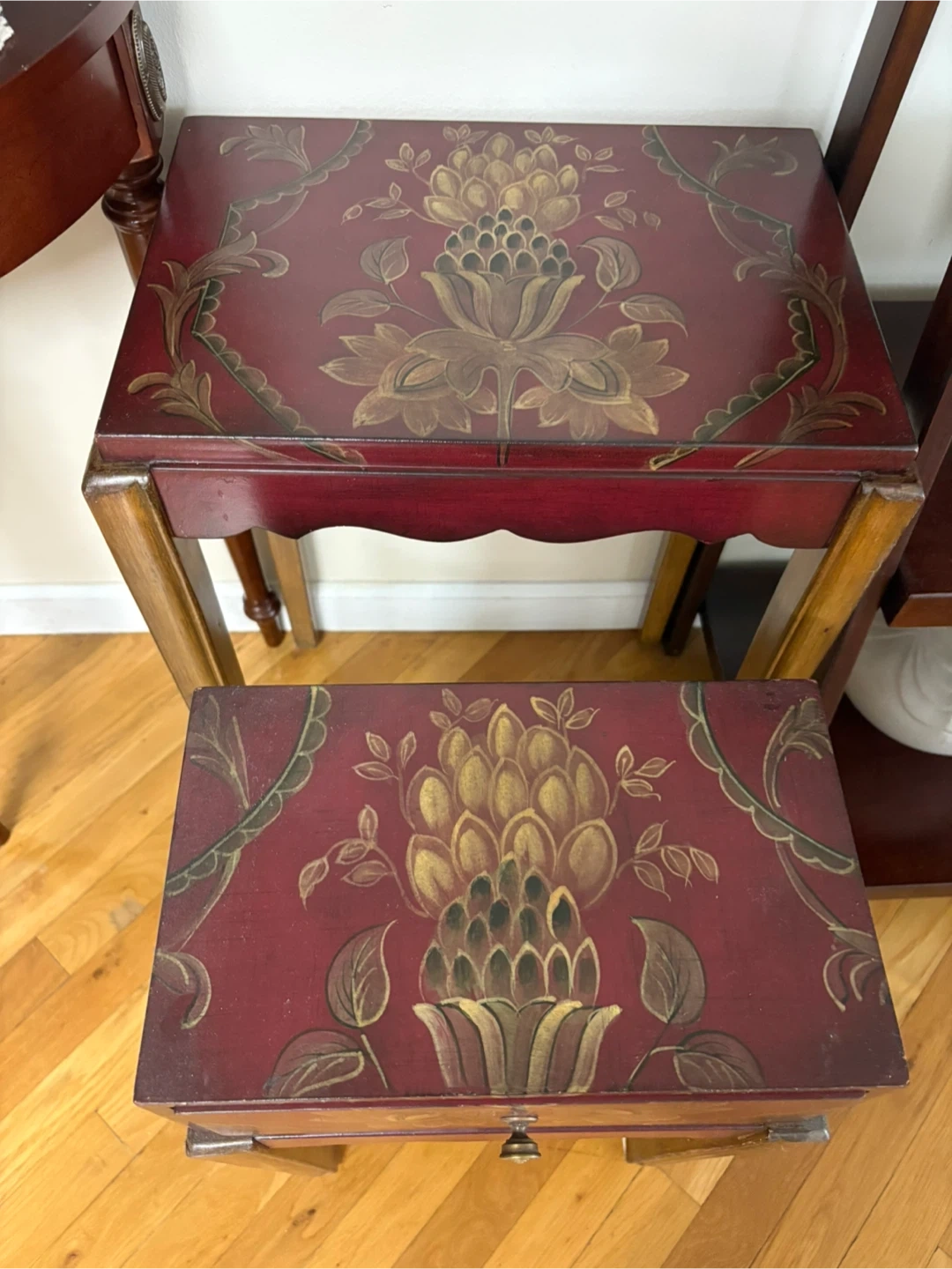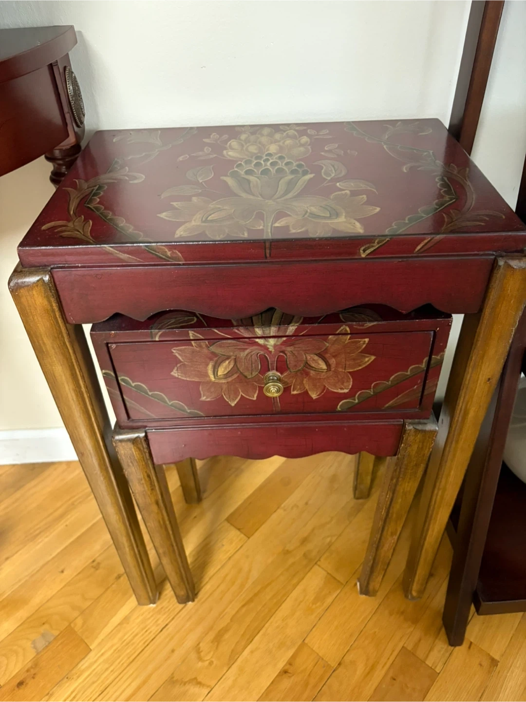 This is a cute accent table set featuring a unique floral design painted on top and on the drawer front. It's perfect for adding a touch of charm to any room. The table has a reddish-brown color with gold floral accents and wooden legs