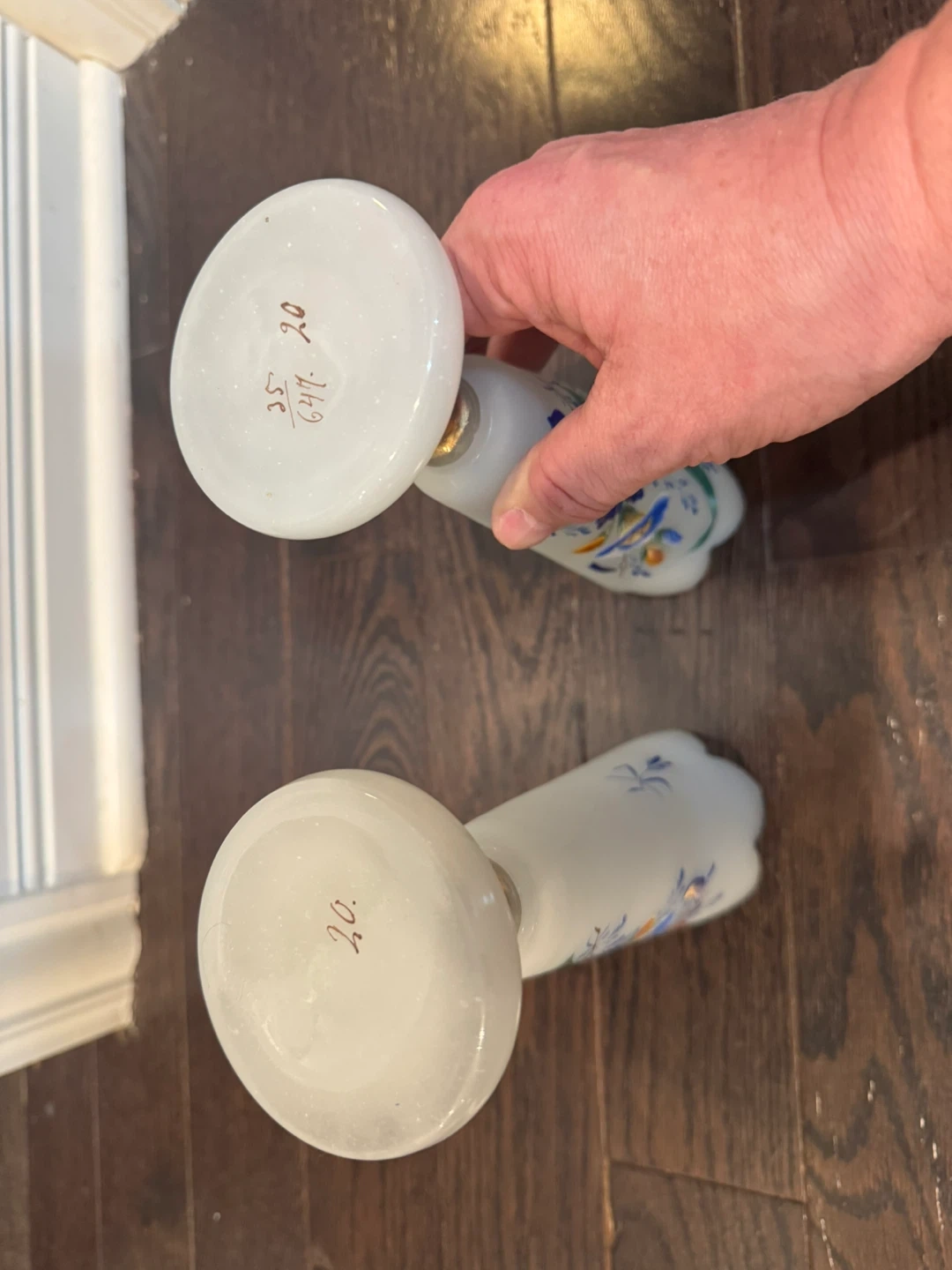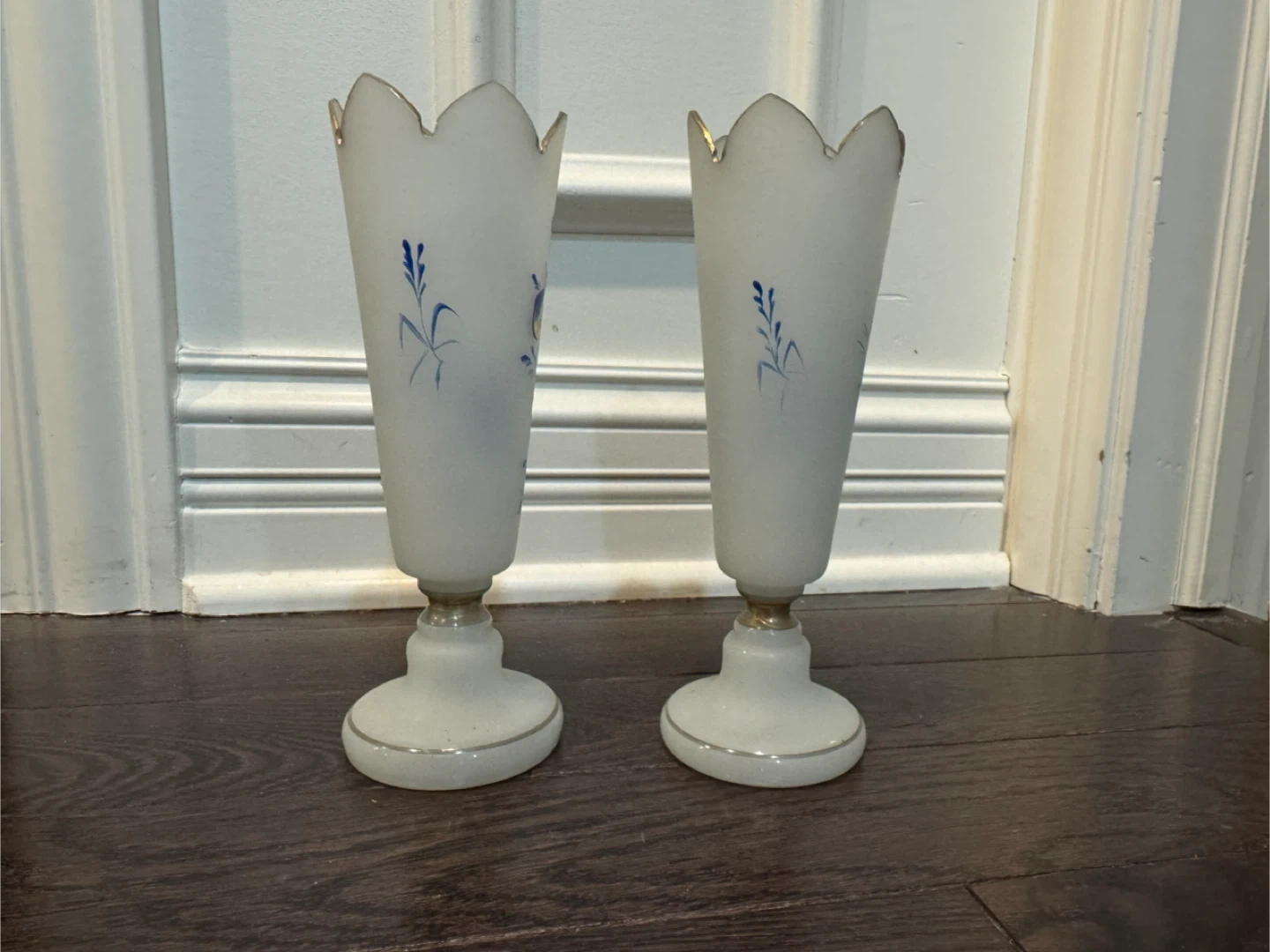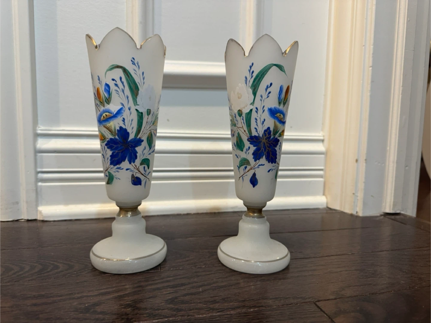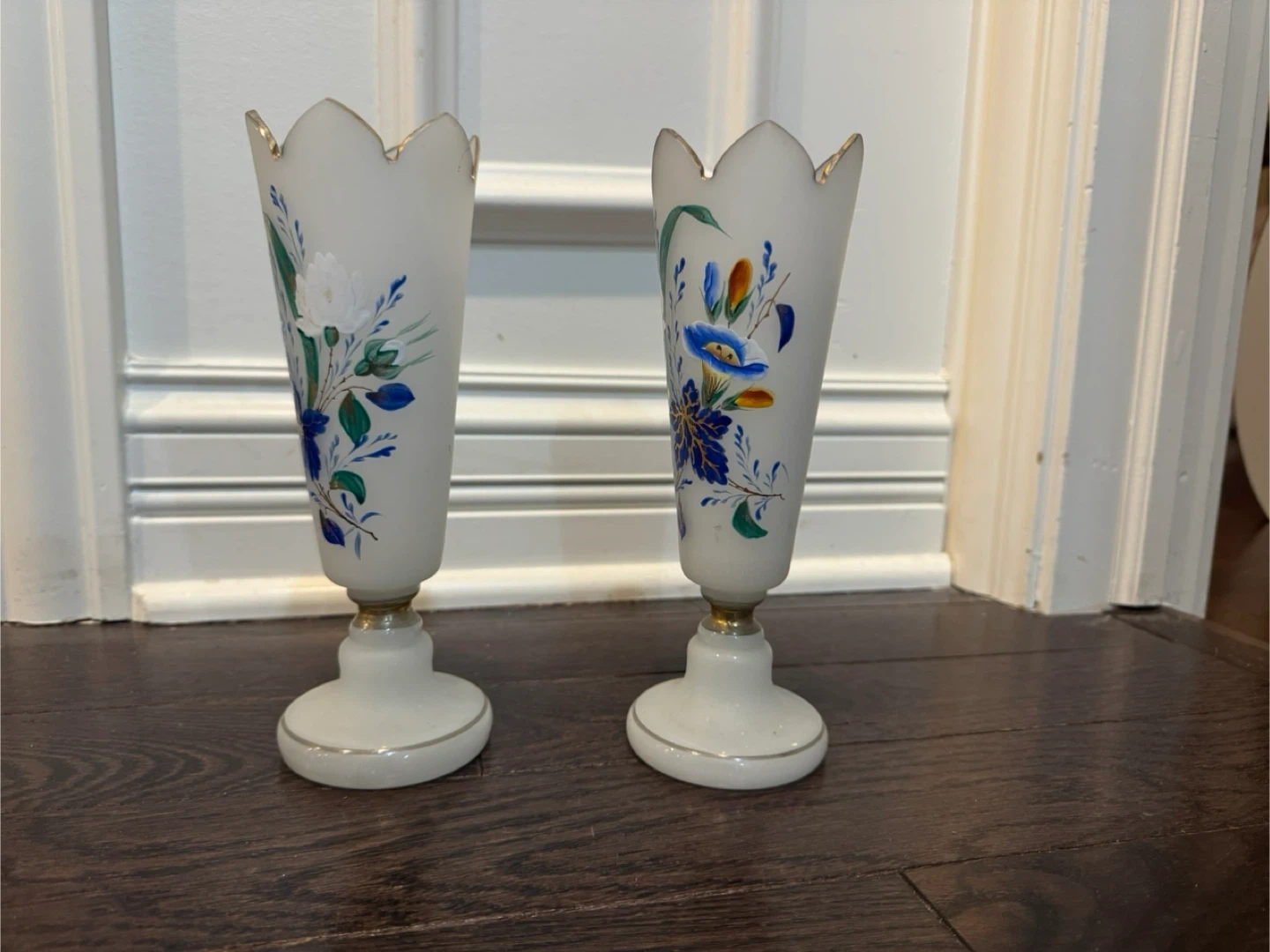 Selling a set of two beautifully painted glass vases. They feature delicate floral designs in blue, white, and green. These vases would make a lovely addition to any home decor!