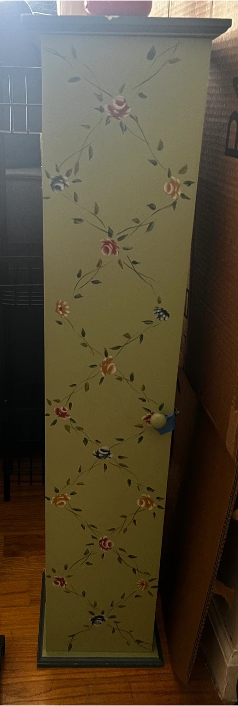 86Mug holder. This is a wooden cabinet with a light green background and a floral pattern painted on it. It's a unique piece that could add a touch of charm to any room. Pickup at Jones and 4th