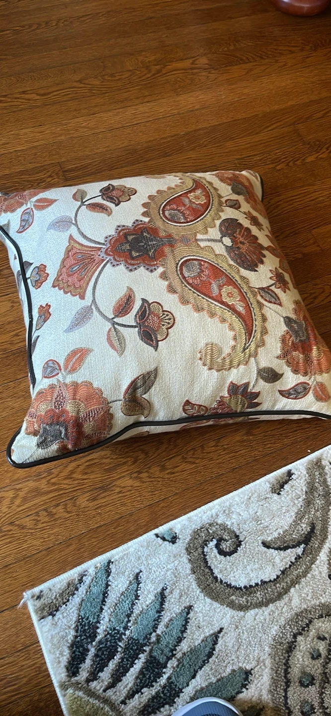 10This is a beautiful floral paisley throw pillow that would look great on any couch or bed. It's in excellent condition and ready for a new home! The pillow features a cream-colored background with a detailed paisley and floral design in shades of orange, brown, and gold.