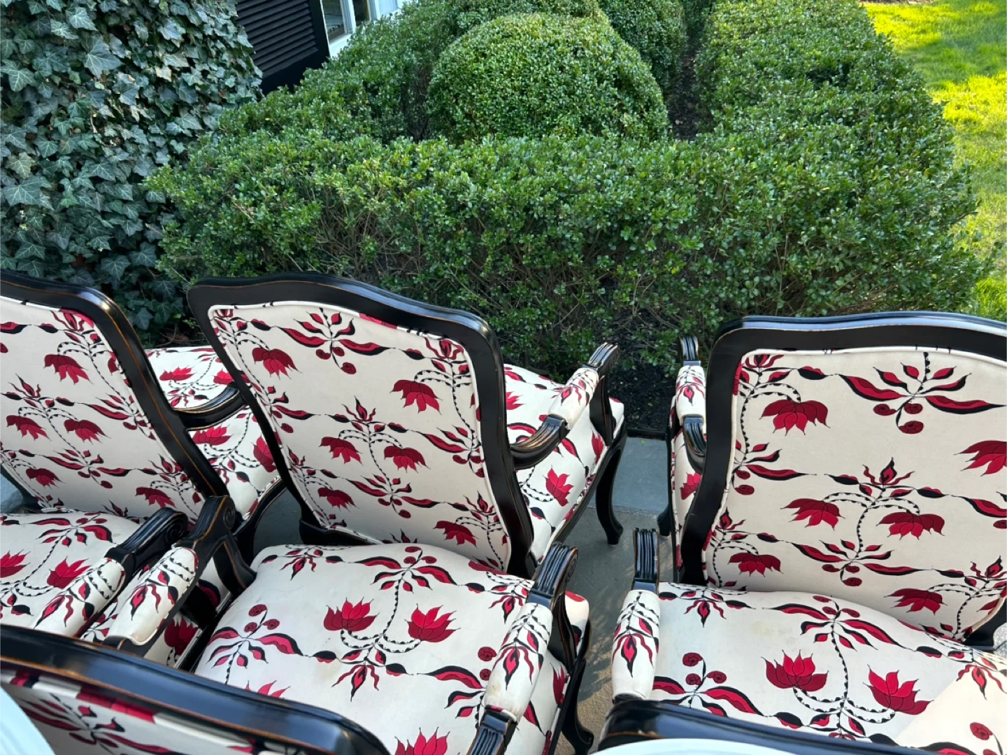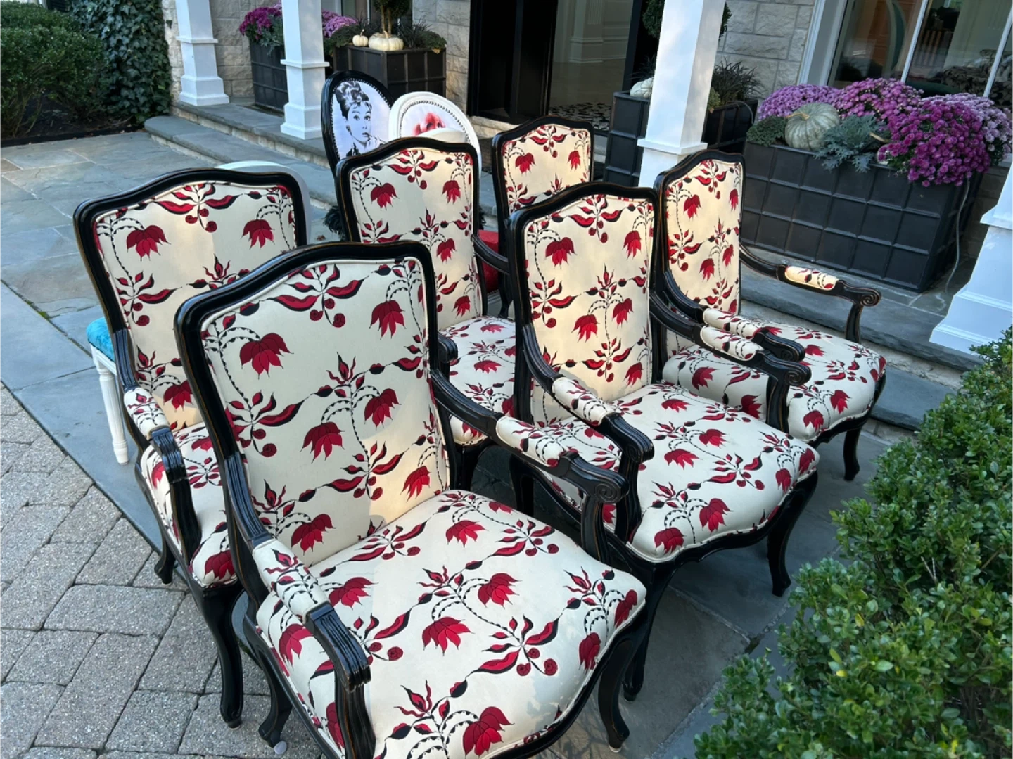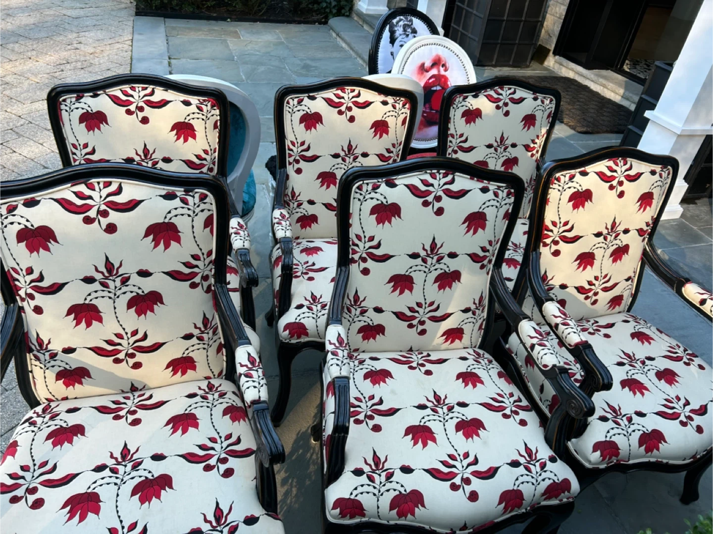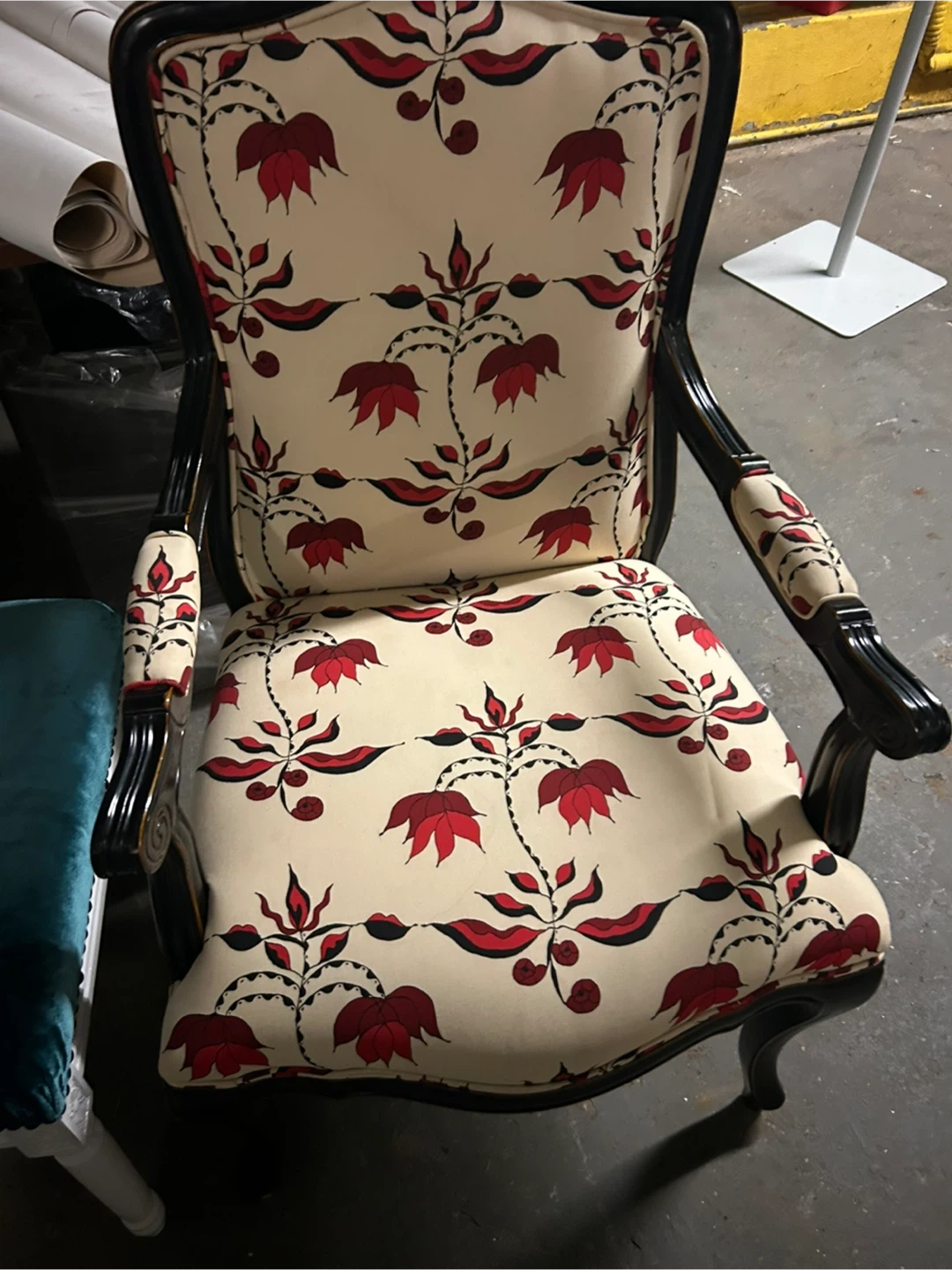 Selling a beautiful accent chair with a unique floral pattern! The chair features a cream-colored fabric with a striking red and black floral design. The frame is a dark wood, adding a touch of elegance. Perfect for adding a pop of color and style to any room $75 each.