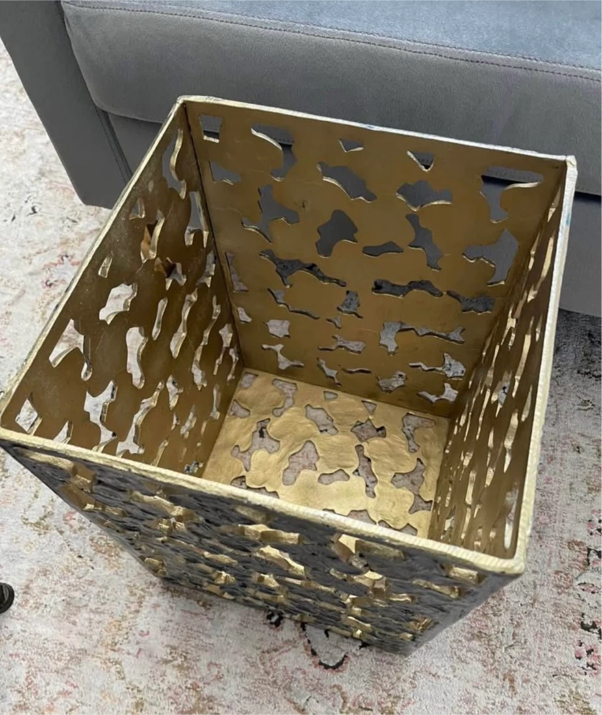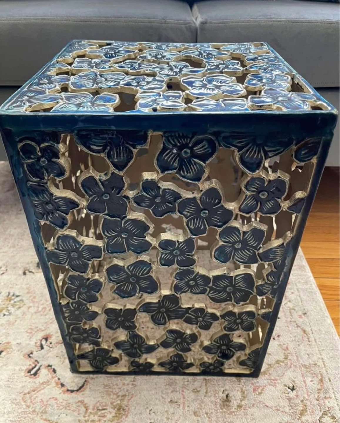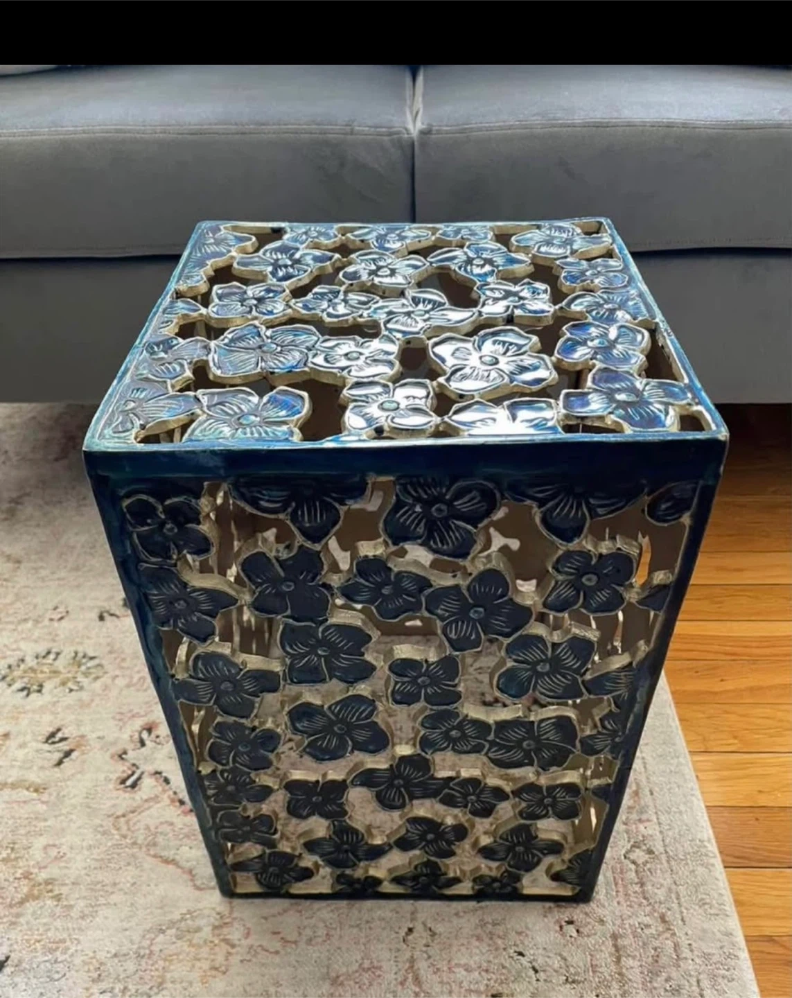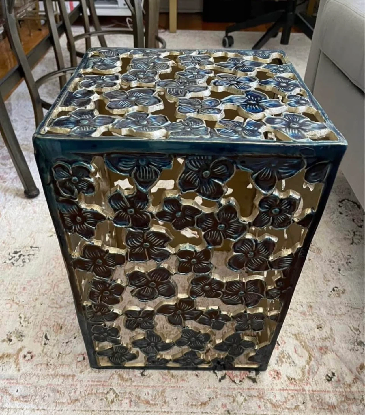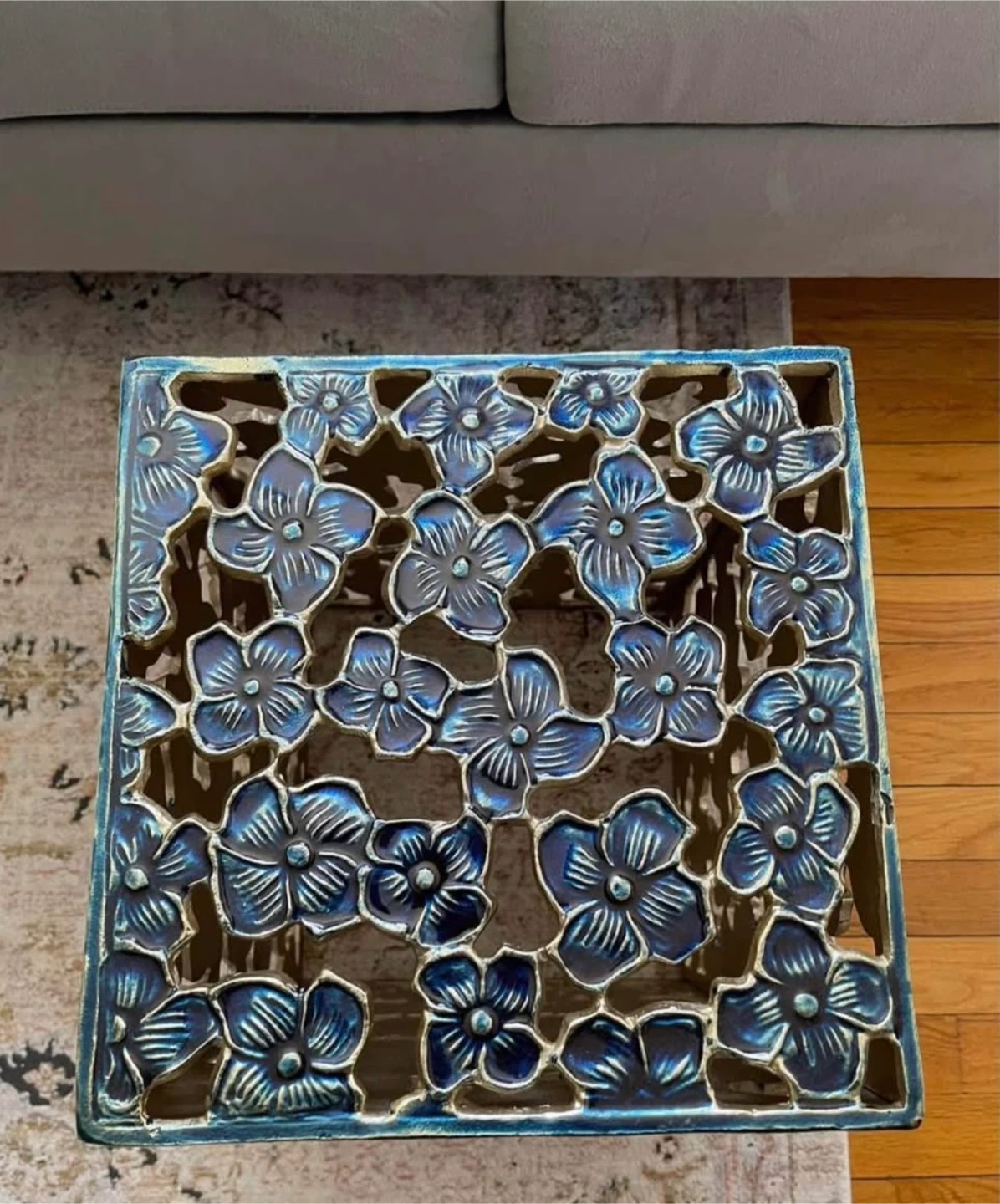 This unique side table features a beautiful floral pattern cut out of the metal. It has a blue exterior and a gold interior, creating a lovely contrast. It's in great condition and would add a touch of elegance to any room