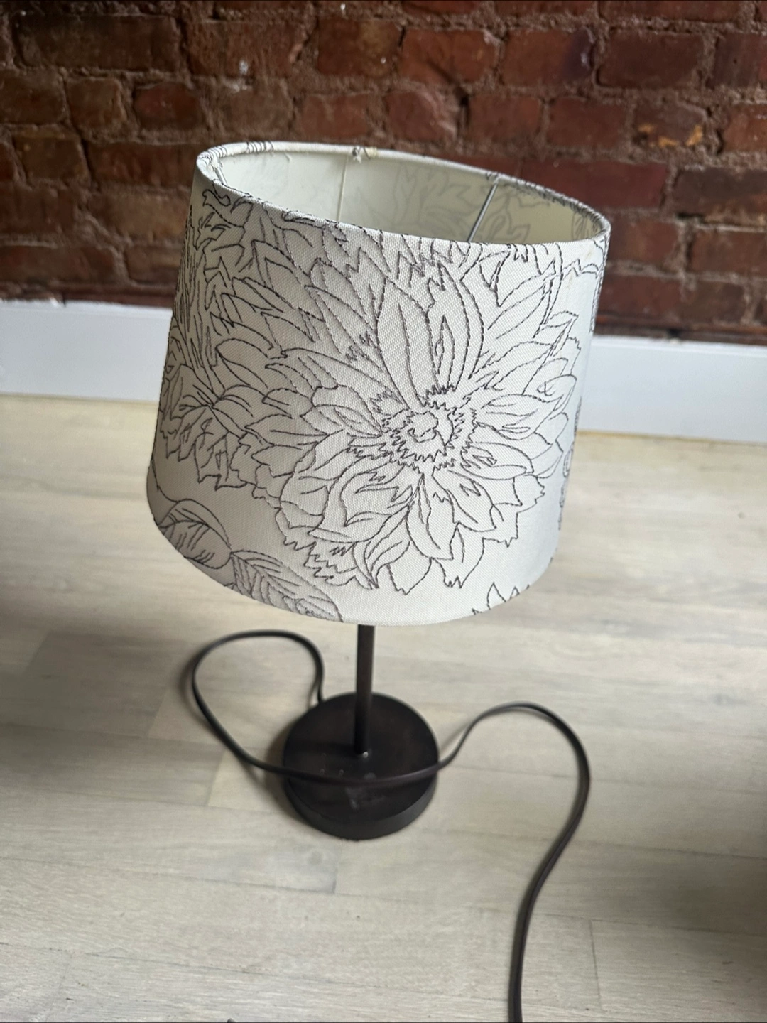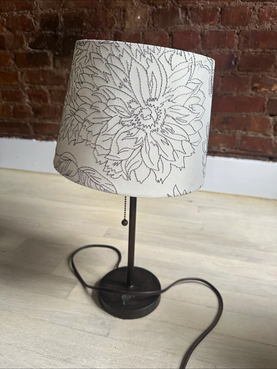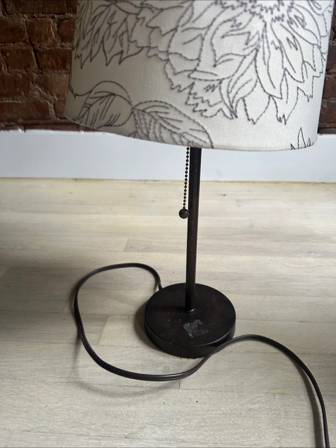 Selling a cute table lamp with a floral pattern on the shade. It’s so cute but note that this particular base only works when plugged in, sadly the pull chain doesn’t work. Still super cute though and the shade can be put on another base too!