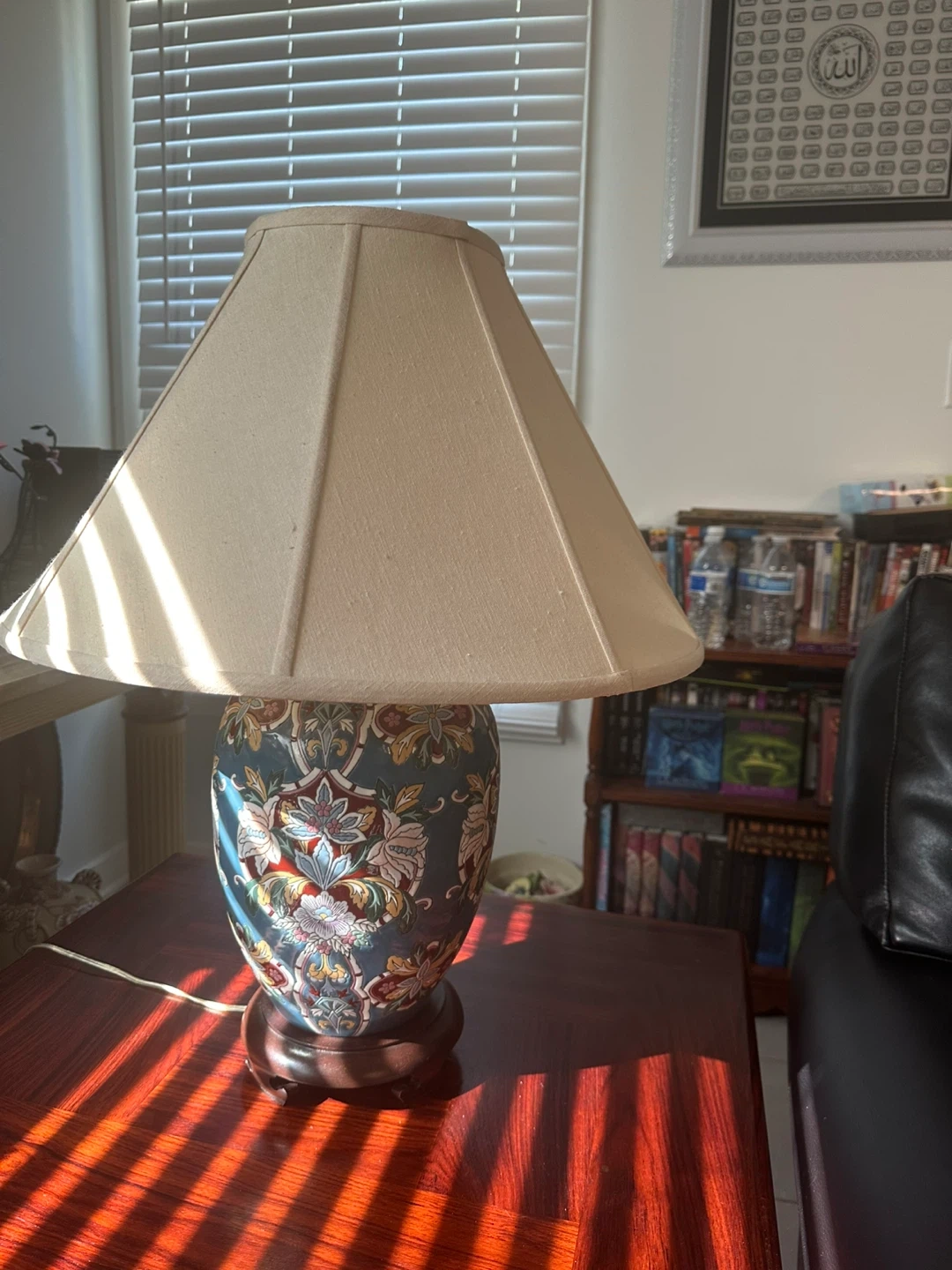Here's a lovely table lamp with a unique floral pattern on the base. The lampshade is a neutral color that complements the base nicely. It would be a great addition to any room!