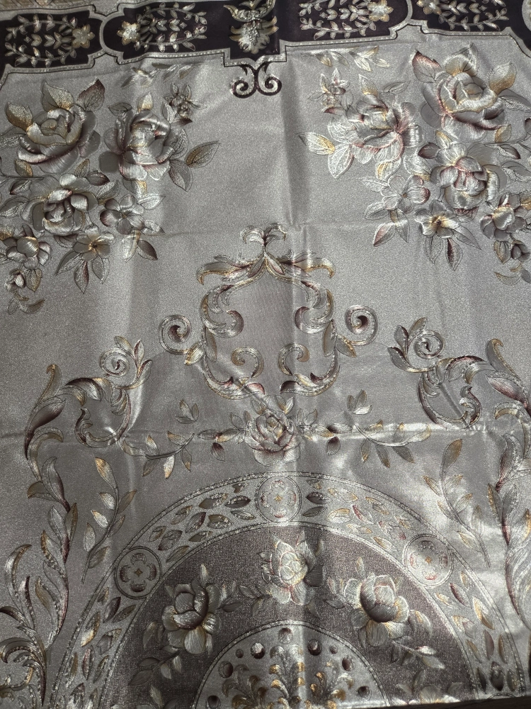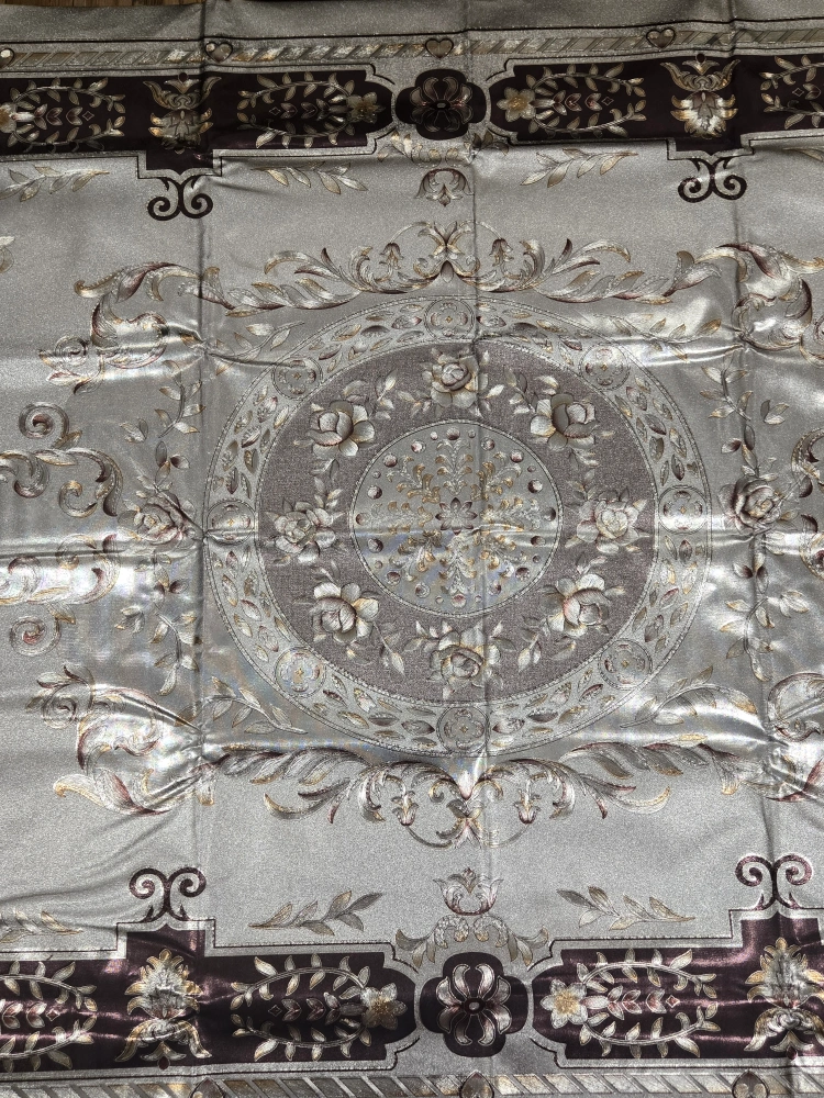 Here's a lovely floral patterned coffee table cover that could add a touch of elegance to your living area. The coffee table features a beautiful design with roses and ornate detailing in shades of silver and brown. It's in great condition and ready to brighten up your home!