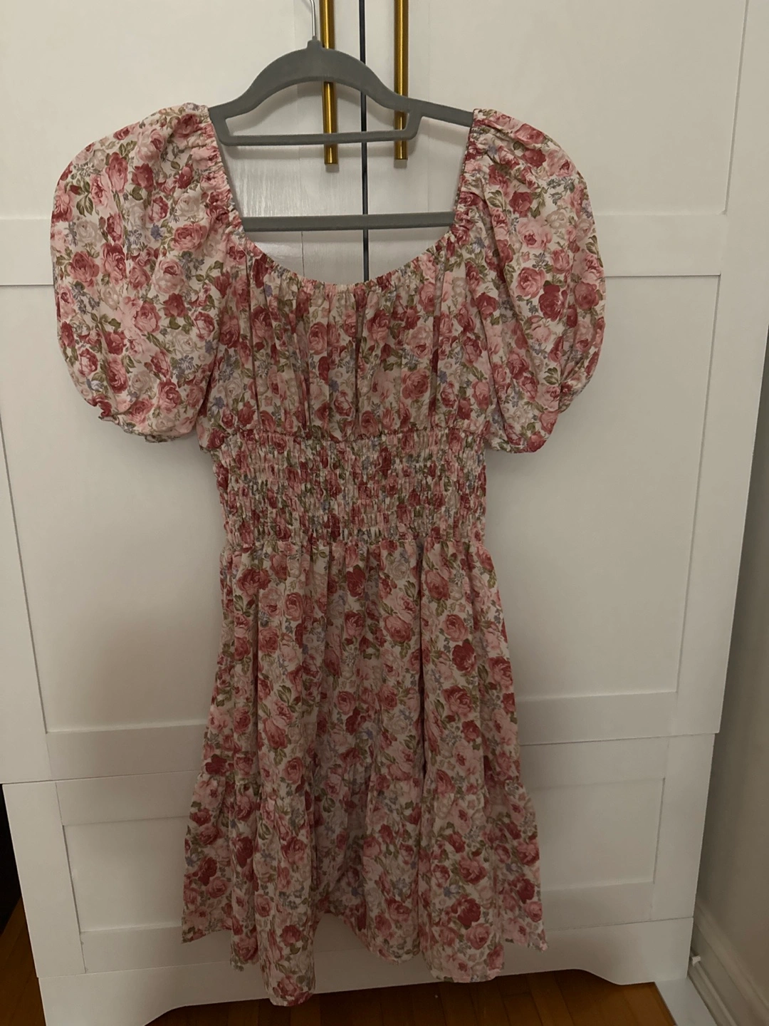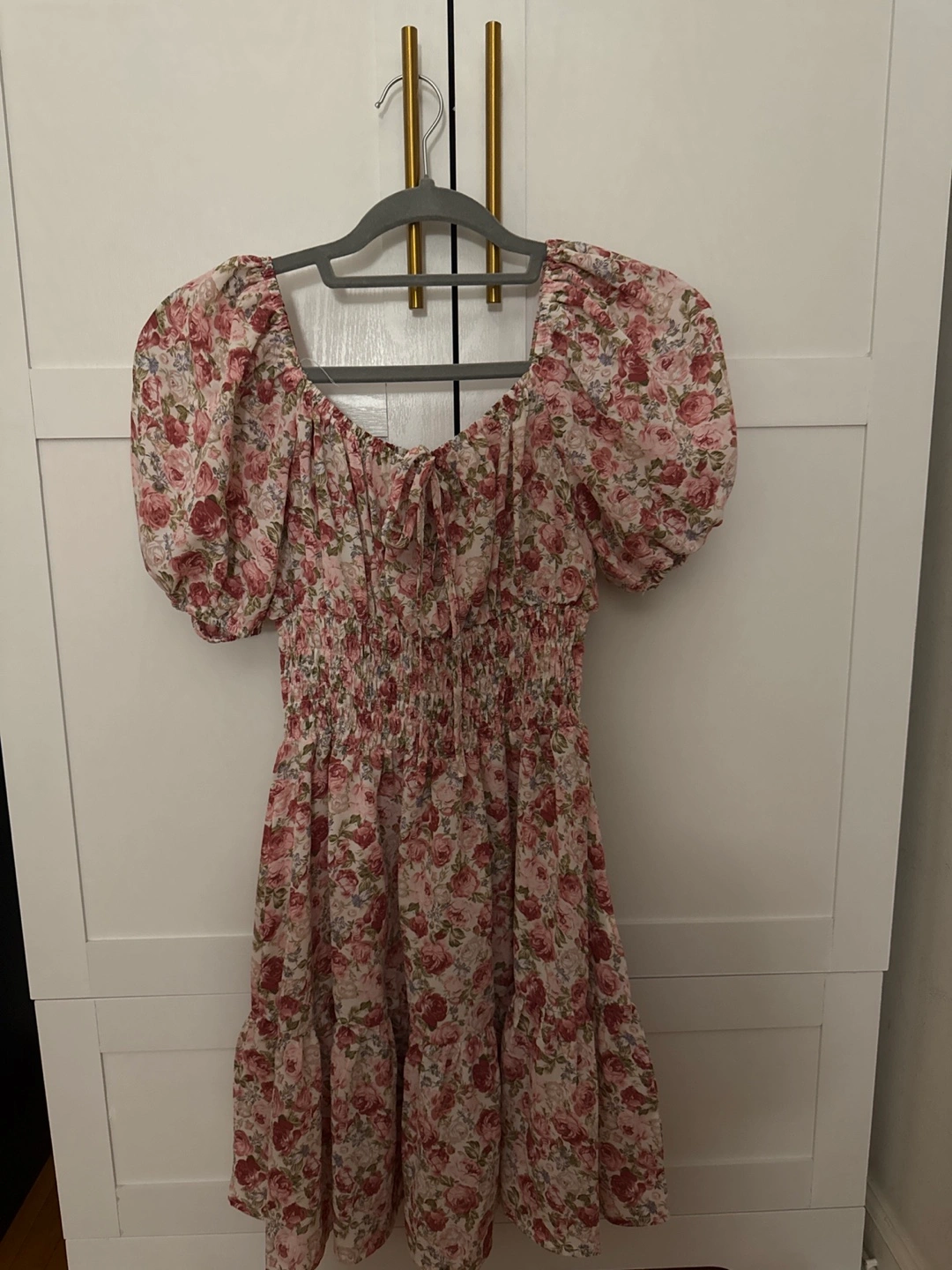 Selling a cute floral print dress! It features a square neckline with a tie detail and short sleeves. The dress has a smocked bodies and a tiered skirt. Perfect for a casual day out or a summer event