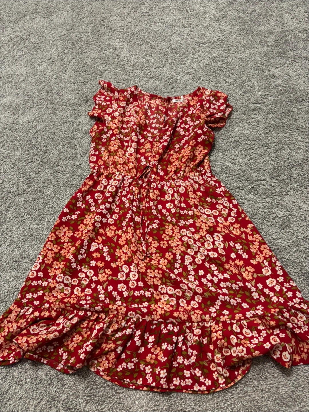 Cute red dress with a floral print! It has a cinched waist and ruffle details. Perfect for spring or summer