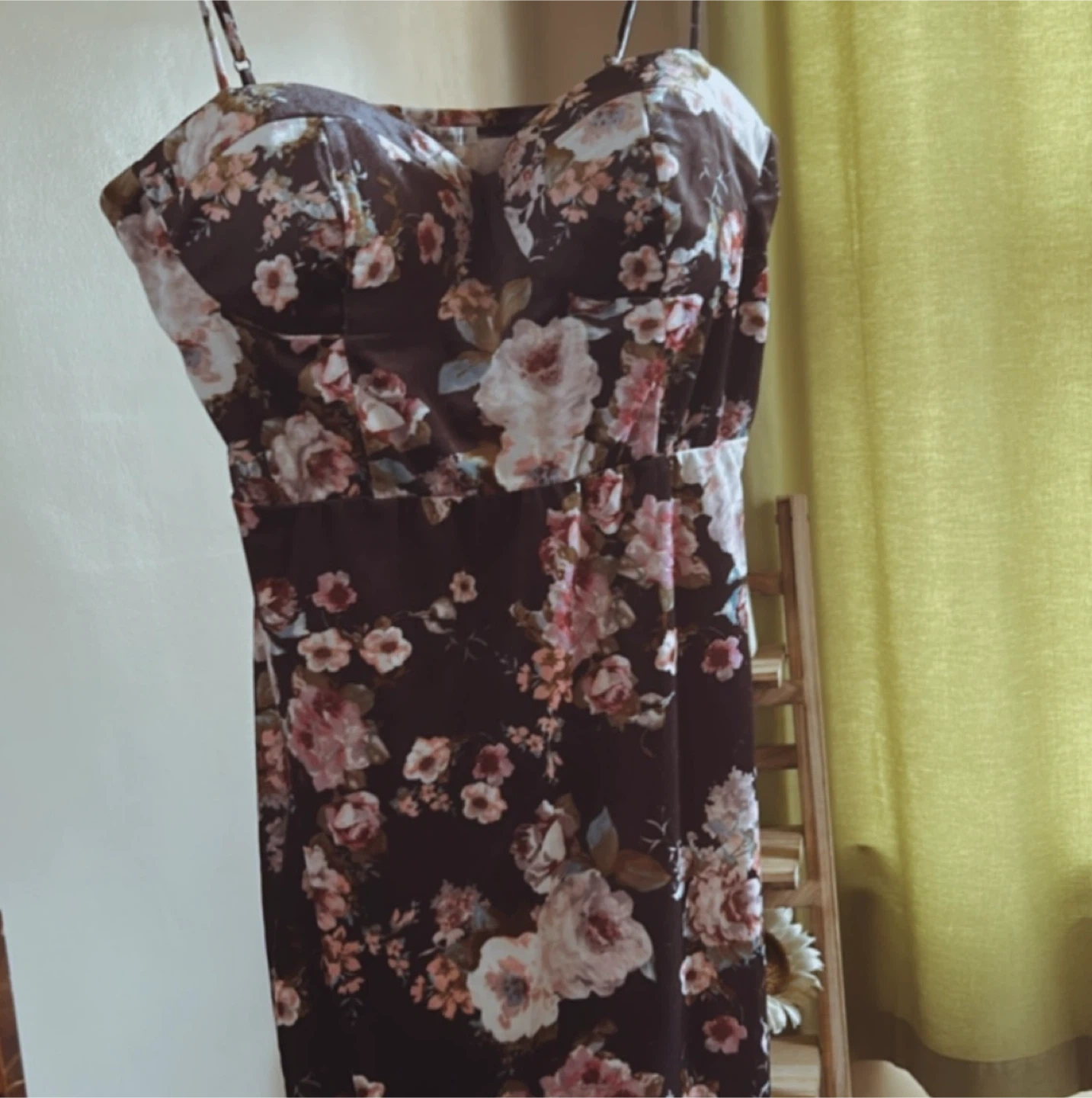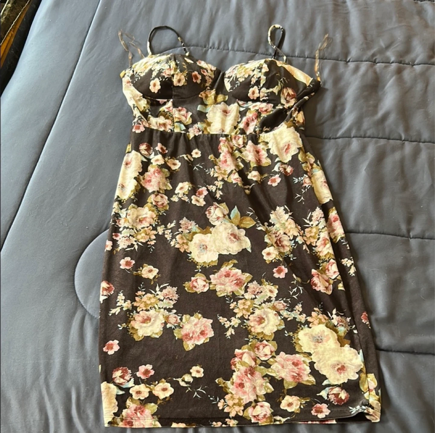 This is a cute floral print mini dress. It has a sweetheart neckline and adjustable straps. Perfect for a night out or a summer day!