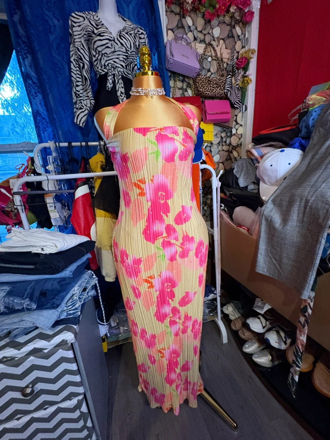 This is a stylish pleated maxi dress with a vibrant floral print. It's perfect for a casual day out or a summer evening. The dress has a flattering silhouette and comfortable fit.