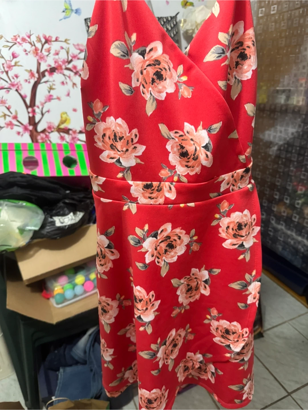 This is a cute red dress with a floral print pattern. It's in great condition and ready for a new home! The dress features a flattering silhouette and a comfortable fit. Perfect for a casual outing or a special occasion