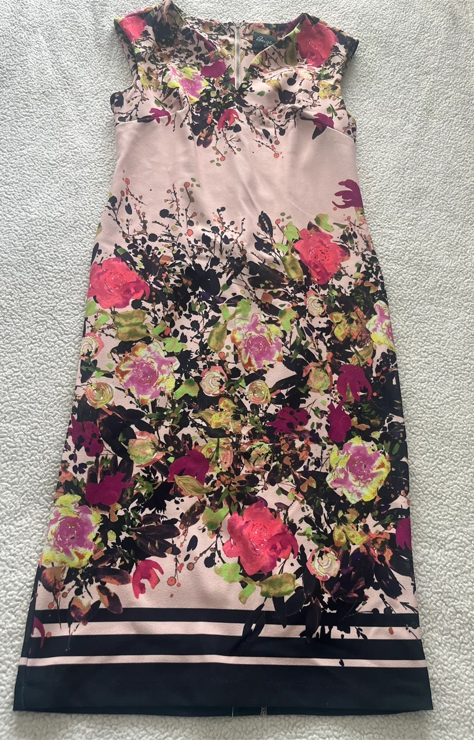 This is a beautiful floral sheath dress. The dress is a pink color with a floral pattern. It has a zipper in the back..