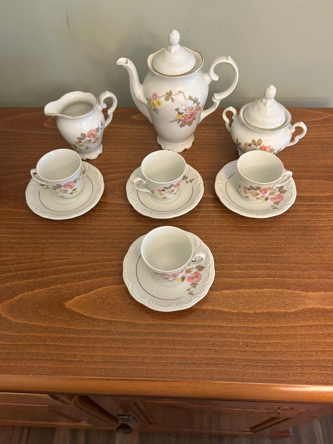 Selling a charming floral tea set. It includes a teapot, creamer, sugar bowl, and four teacups with saucers. The set features a delicate floral pattern on a white background, perfect for adding a touch of elegance to your tea time