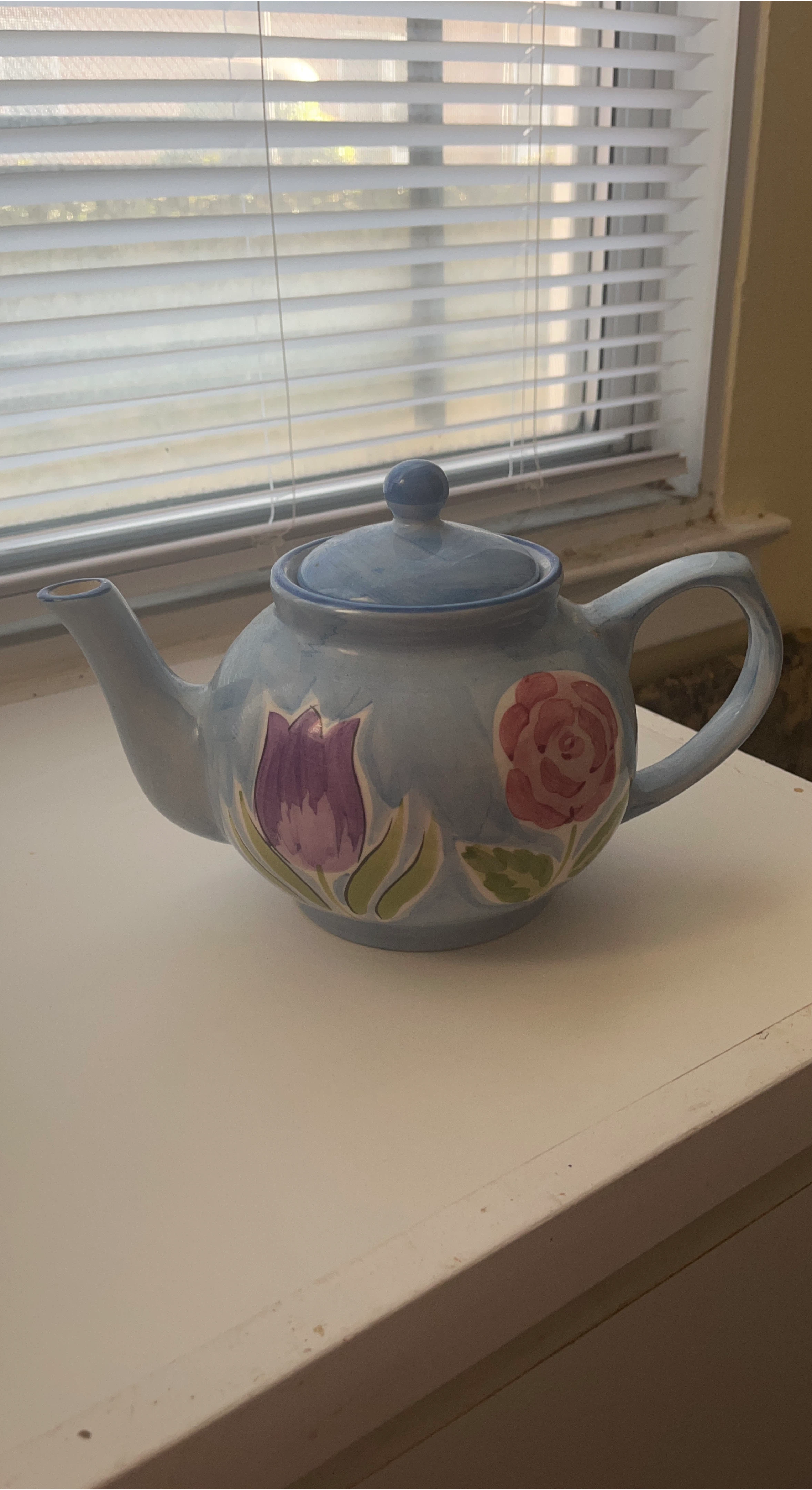 Here is a cute teapot with floral designs. It's light blue with a purple tulip and a pink rose. Perfect for tea time!