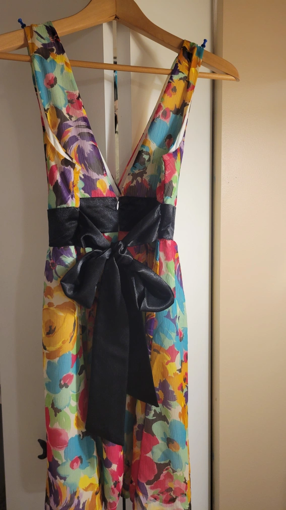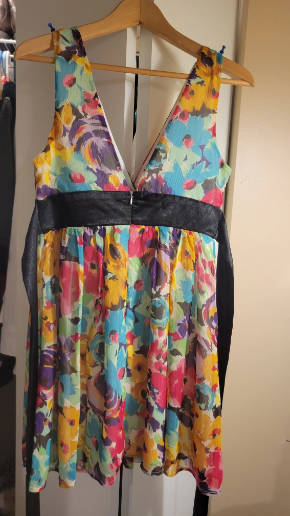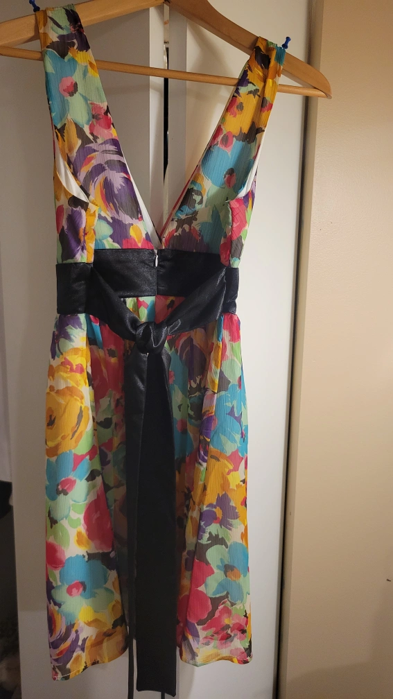 Selling a cute floral dress with a V-neck, and V- backwith a black belt attached. measures 33 in long . Can be worn as a dress or shirt. In great condition and perfect for a night out. The colorful floral pattern is eye-catching and the black belt adds a touch of elegance.