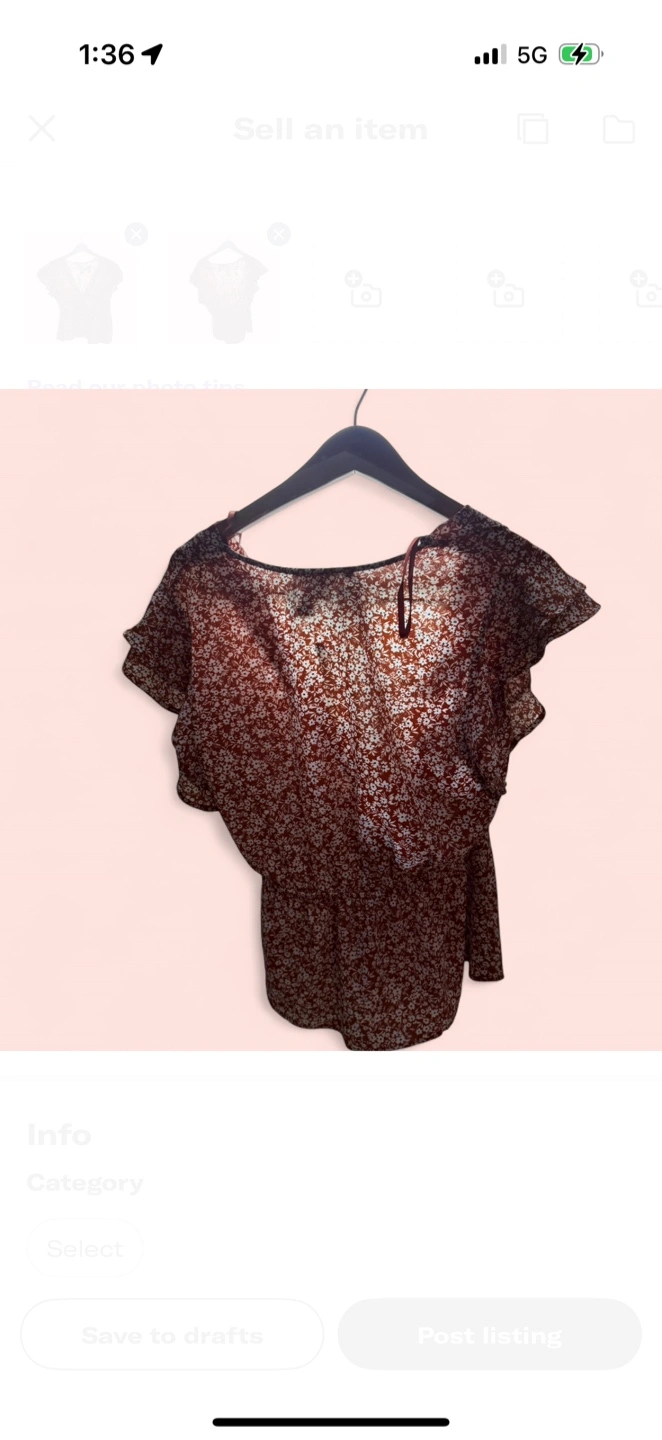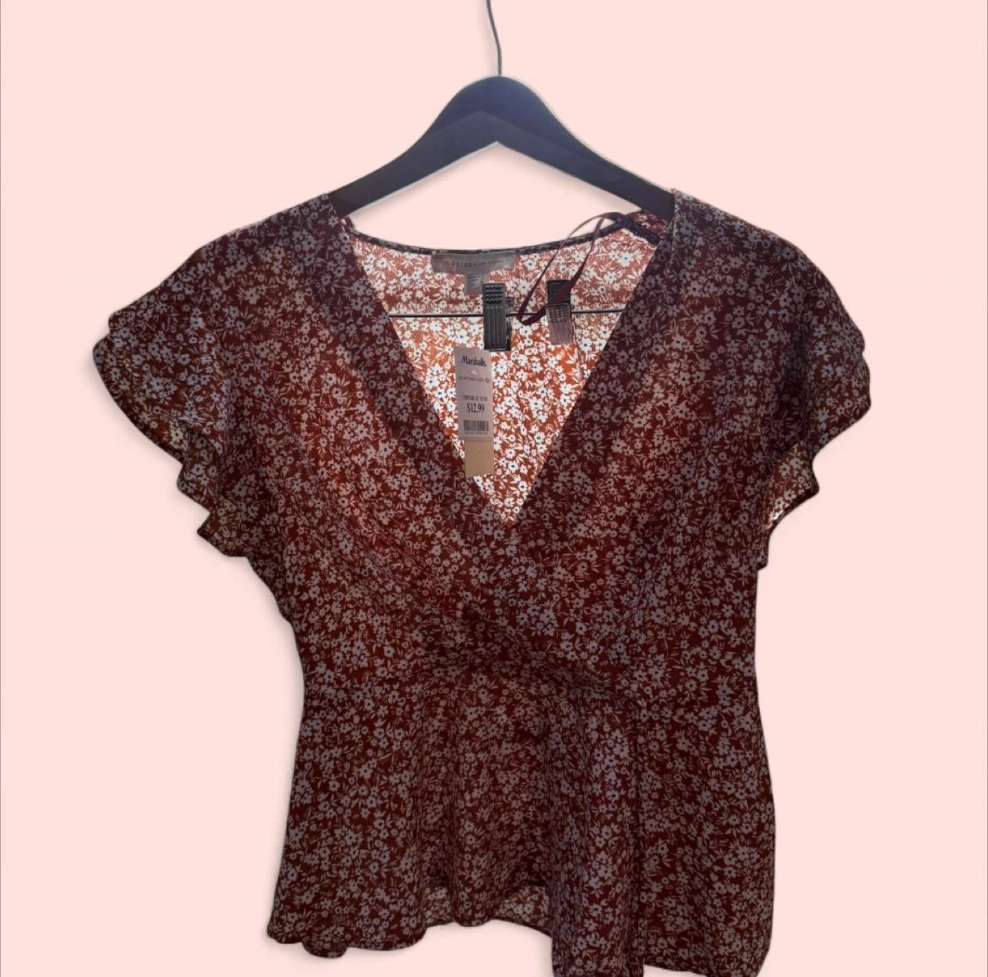 This is a cute floral print top with a V-neck and ruffle sleeves. It's in great condition and ready for a new home! The original price tag shows $12.99