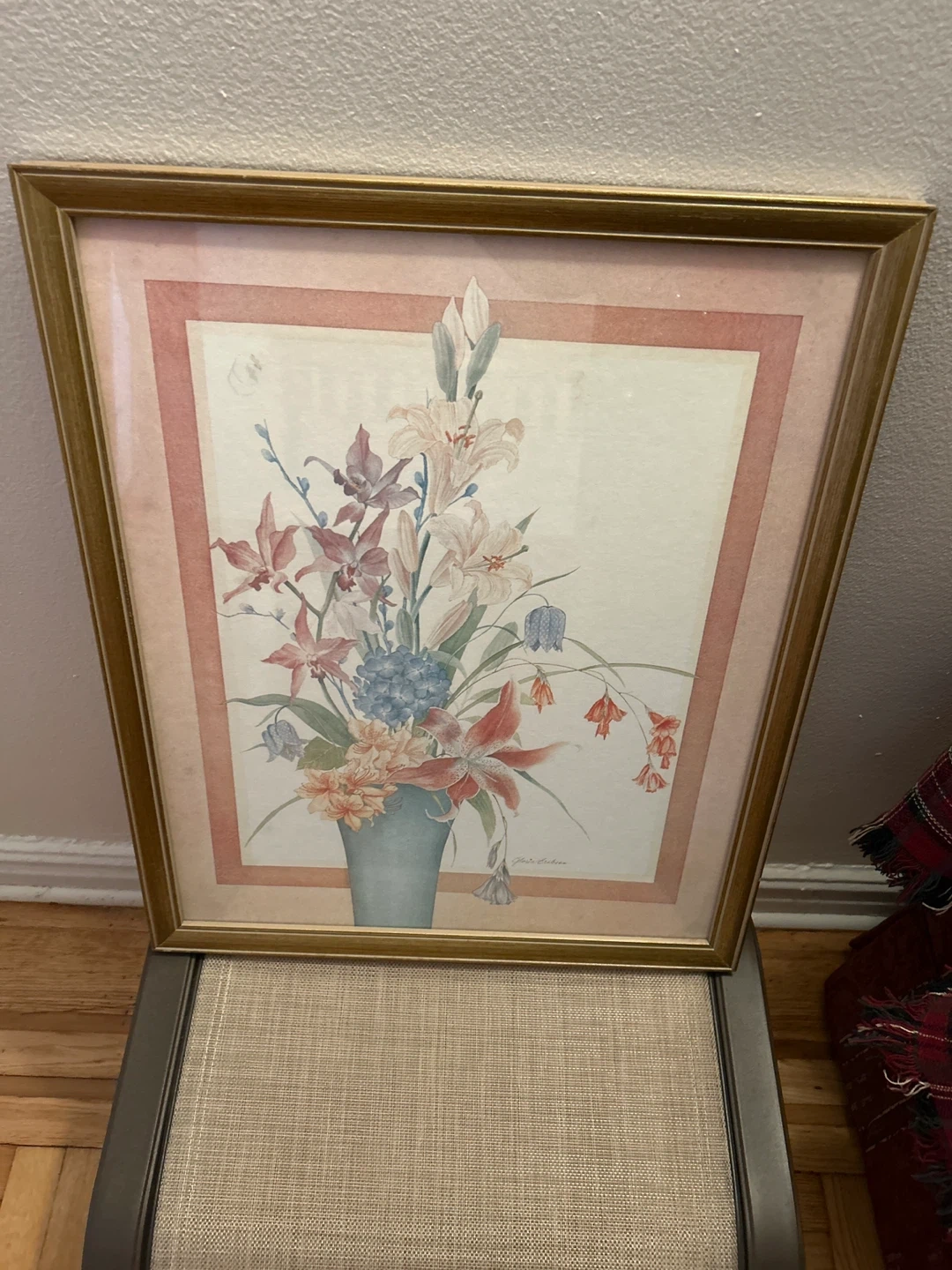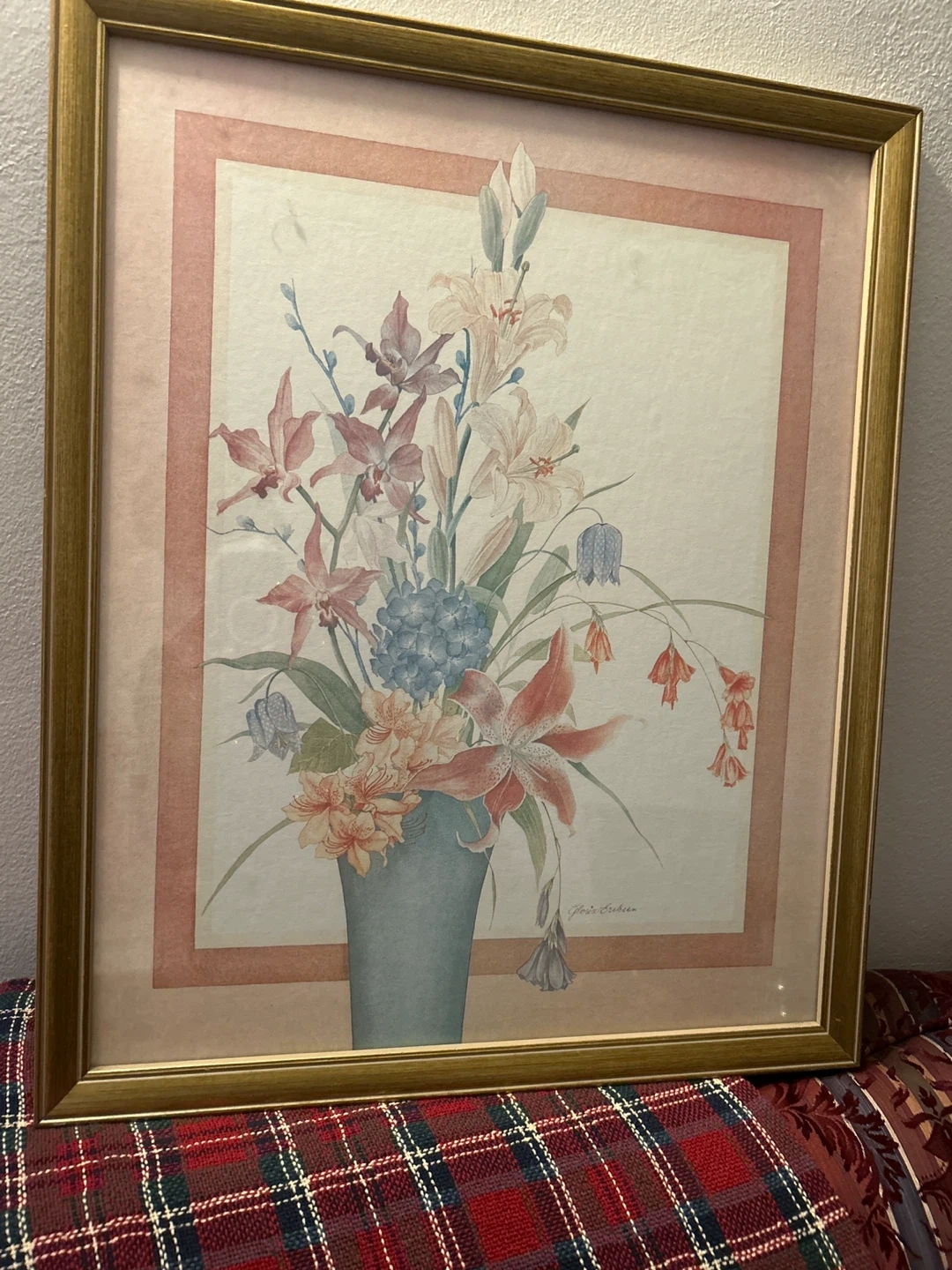 60Vase of radiant flowers looking beyond any challenge below big in hope and growing tall solidly grounded by a sturdy blue vase. Size:23x19” Framed in wood and glass. Signed.