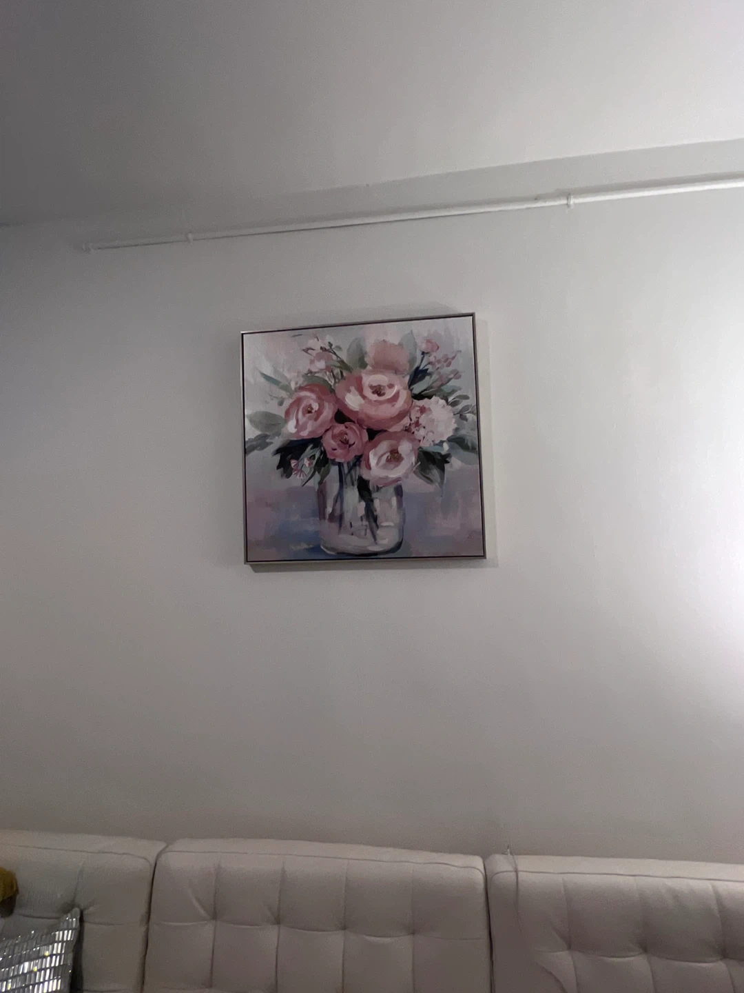 135A beautiful piece of floral wall art that would add a touch of elegance to any room! The painting features a lovely arrangement of pink and white flowers in a vase. Perfect for adding a pop of color and charm to your home decor