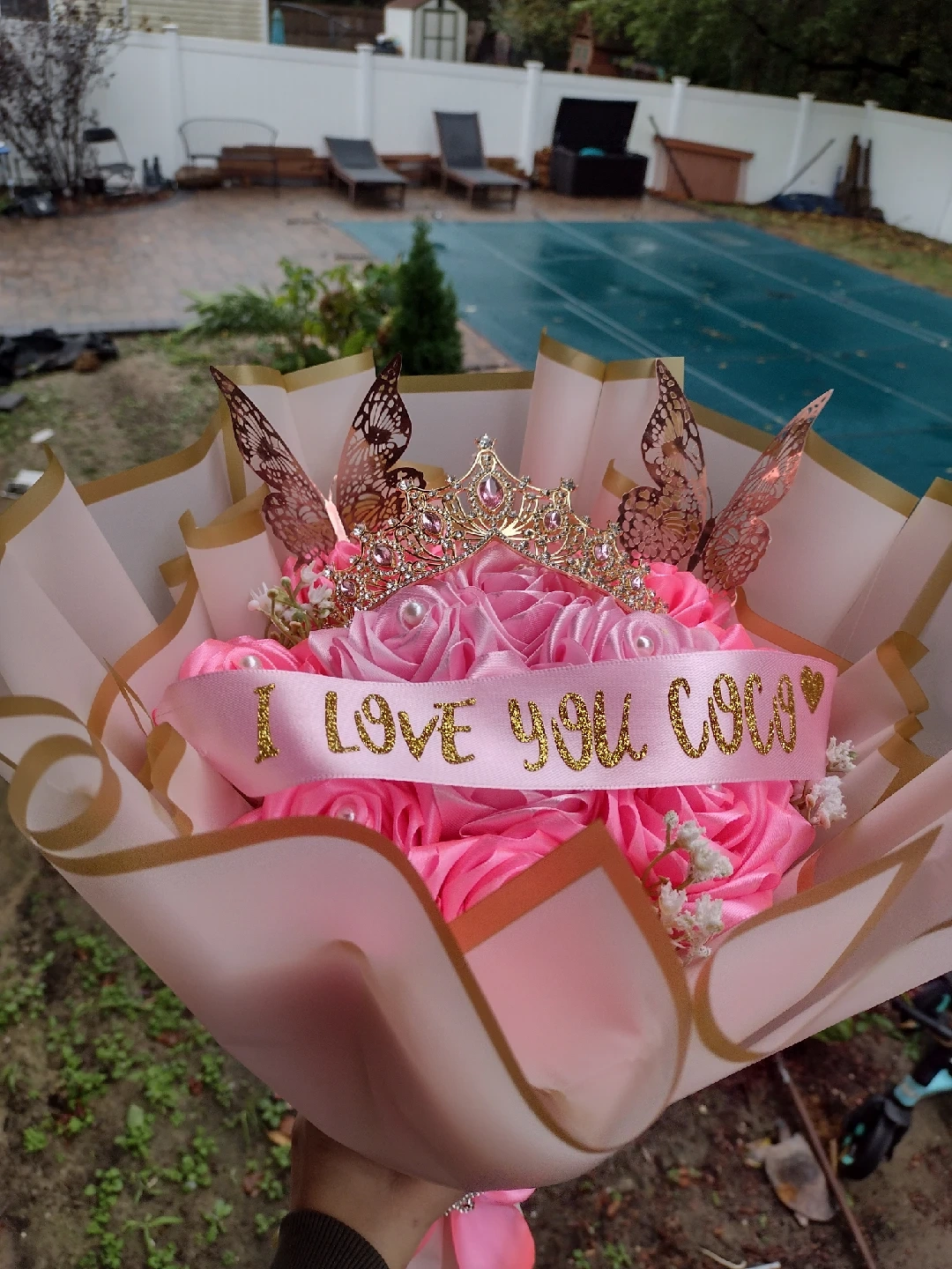 15Selling a beautiful pink rose bouquet featuring a decorative crown and butterfly accents. The bouquet has a ribbon that says "I LOVE YOU COCO". It's perfect for a special occasion or as a unique gift!