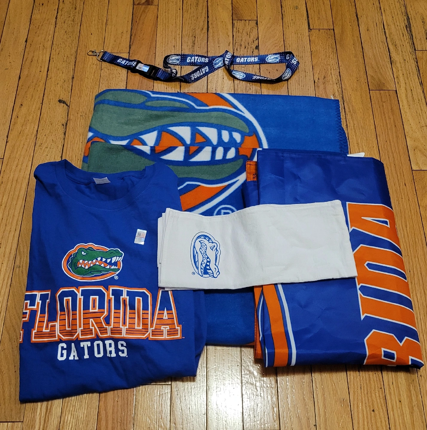 Selling a bundle of Florida Gators merchandise! Includes a T-shirt, towel, flag, lanyard and 2 throw blankets. Perfect for any Gators fan to show their team spirit!