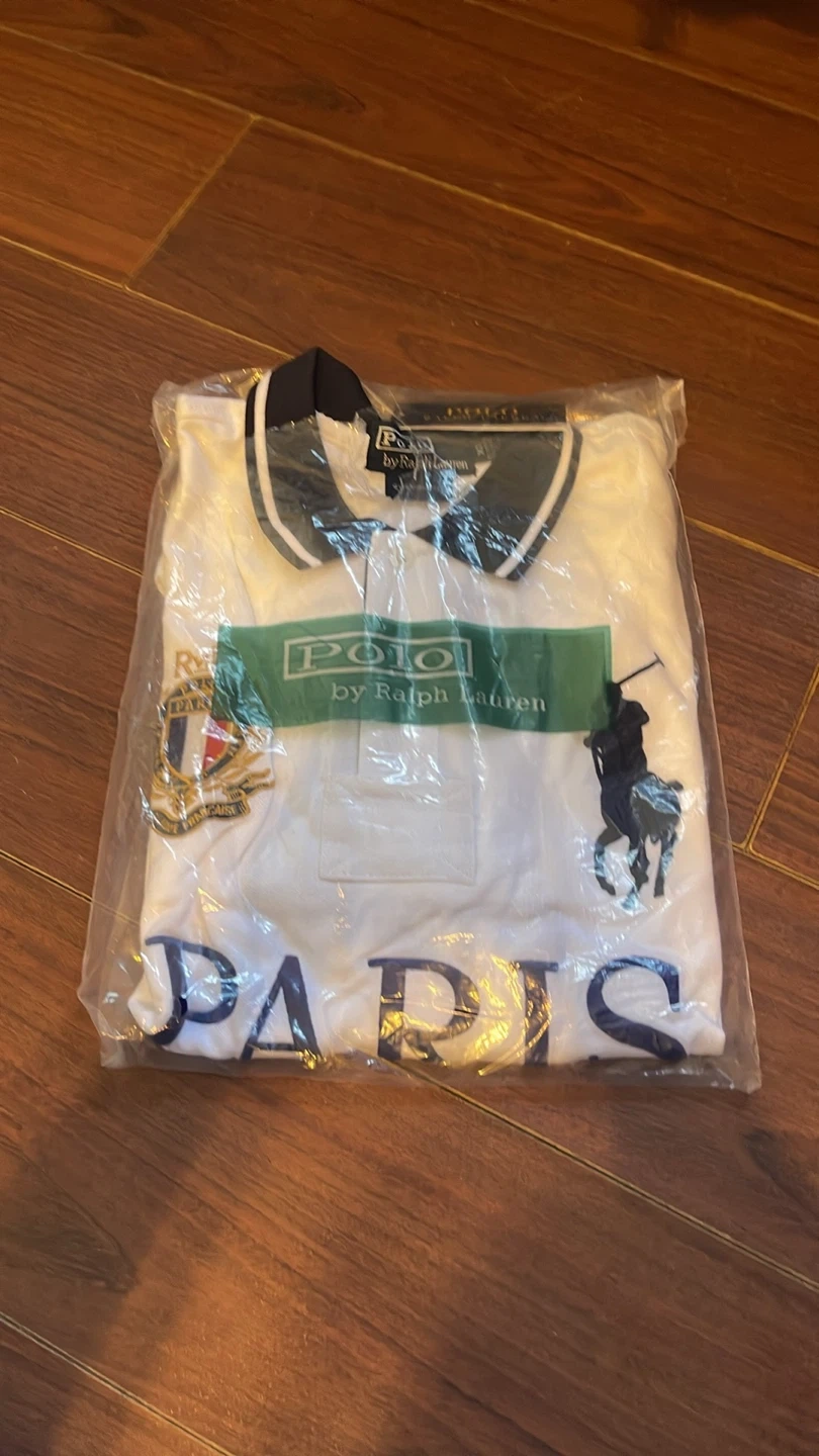 This is a white Polo Ralph Lauren polo shirt featuring "Paris" text and the iconic polo player logo. It has a green accent band across the chest and an embroidered crest on the left chest. It's packaged for protection.