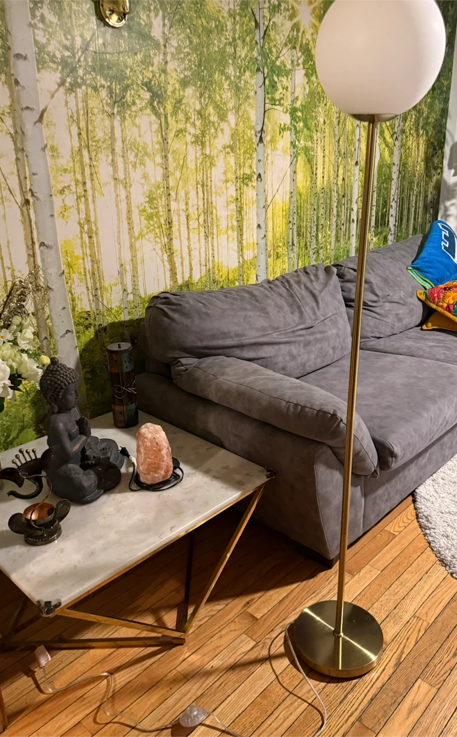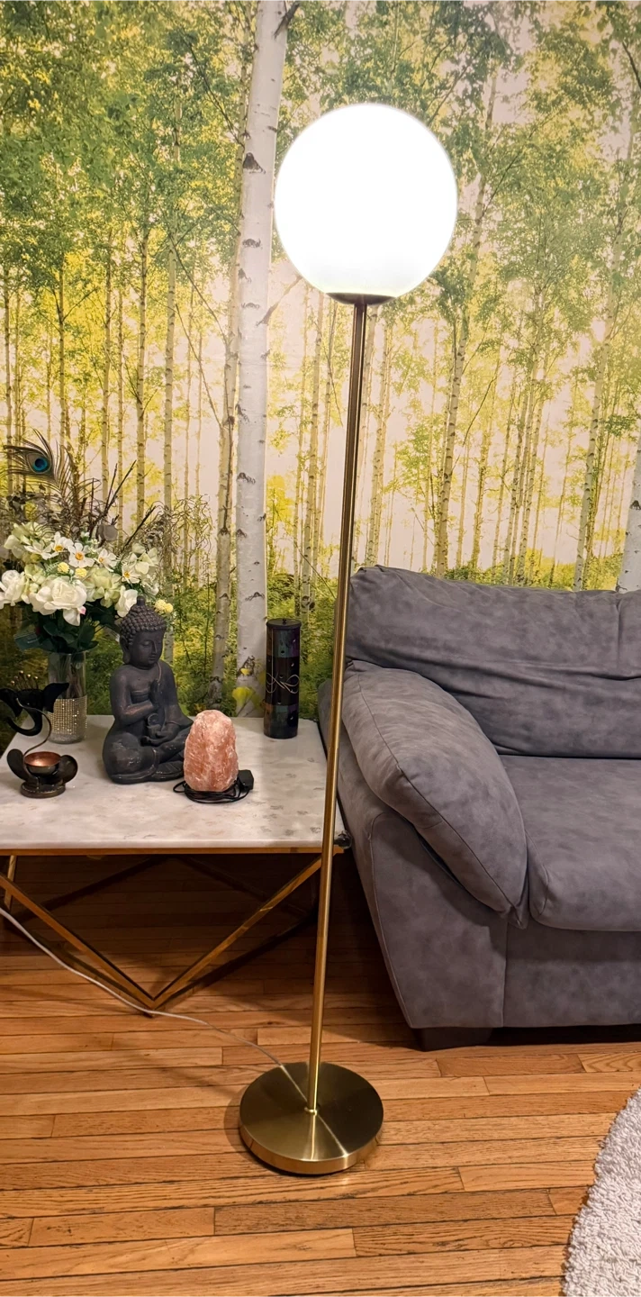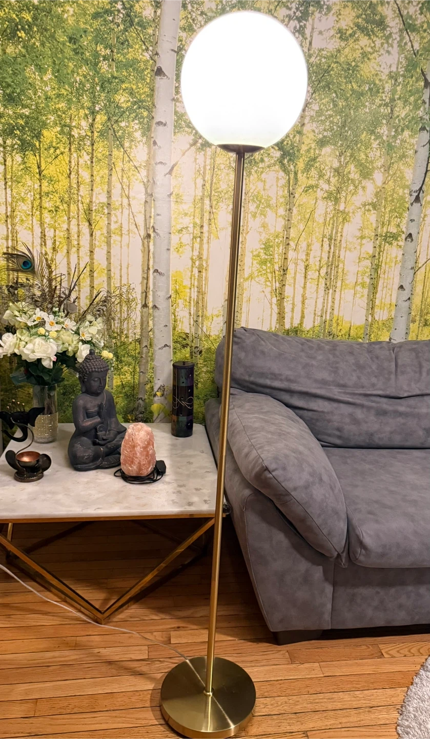 Beautiful modern globe floor lamp with brushed brass finish and frosted glass globe shade. Works perfectly and gives off a warm, soft light that looks great in living rooms, bedrooms, or reading corners.