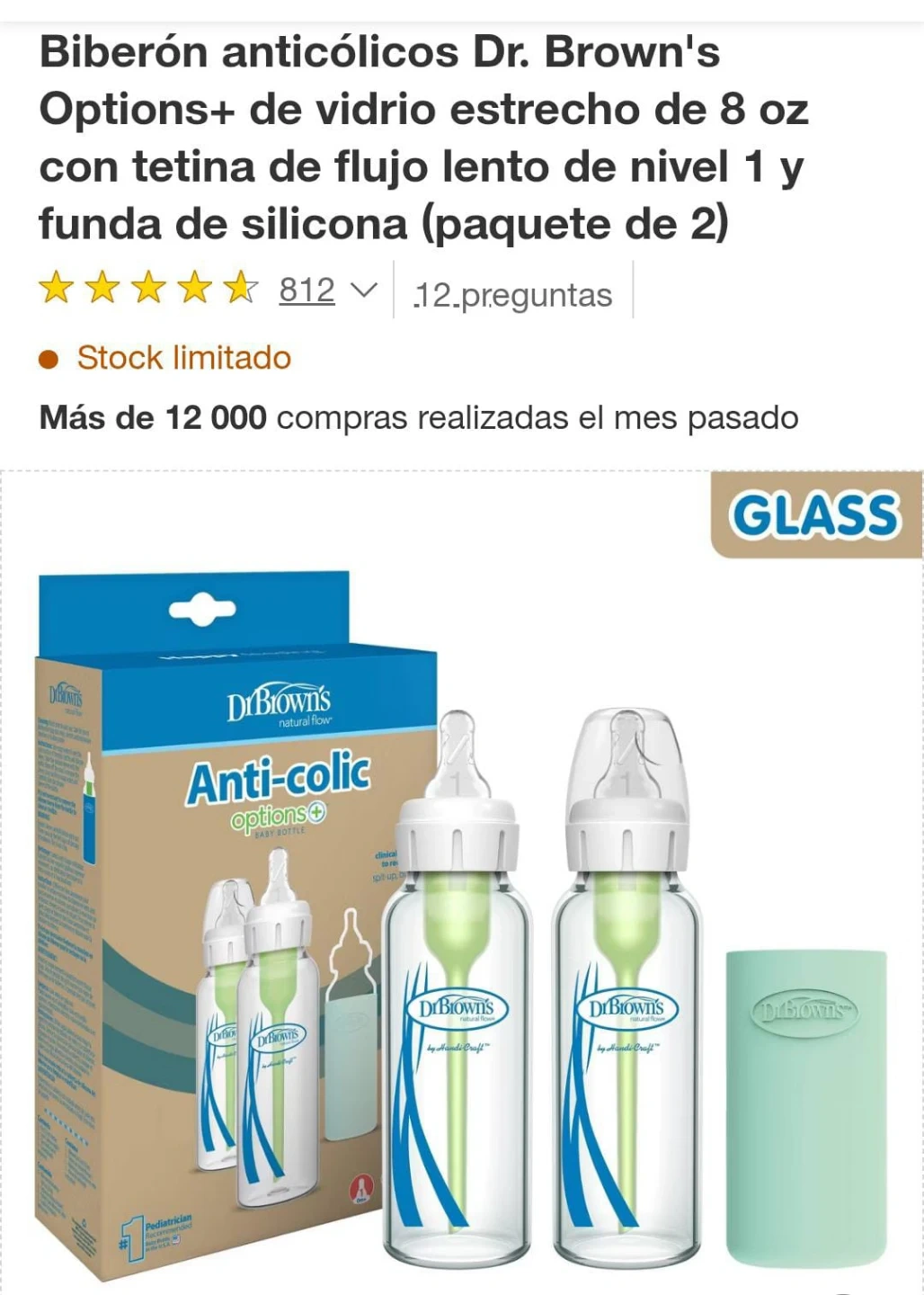 Selling a set of Dr. Brown's Options+ anti-colic baby bottles! These are the narrow, 8 oz glass bottles with level 1 slow-flow nipples and silicone sleeves. Comes as a pack of 2.