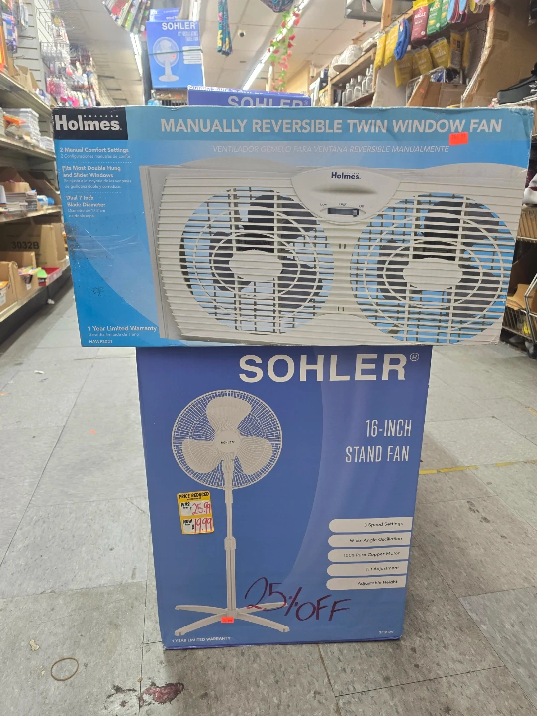 Selling a Holmes Manually Reversible Twin Window Fan and a Sohler 16-Inch Stand Fan.