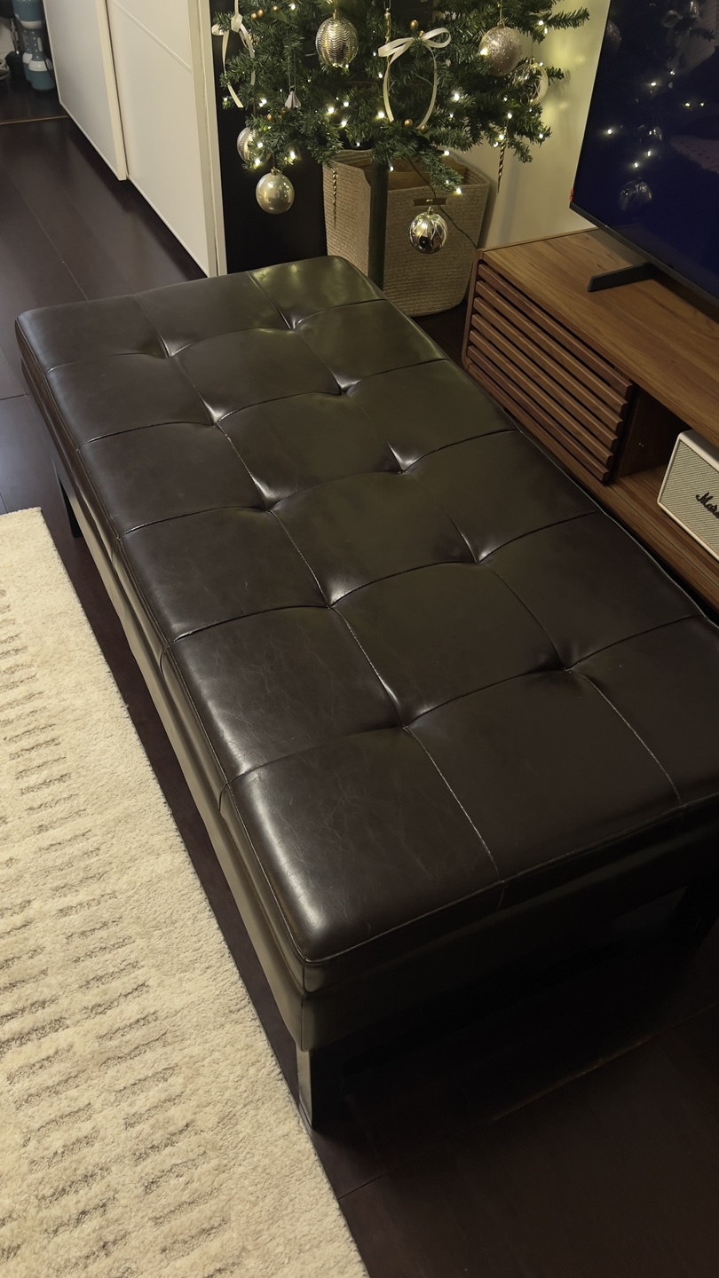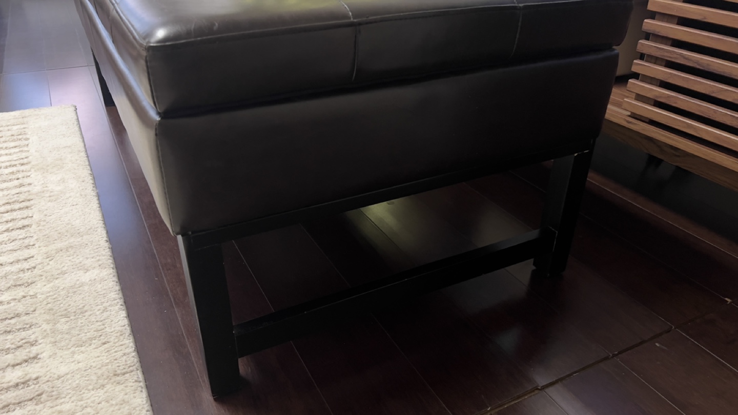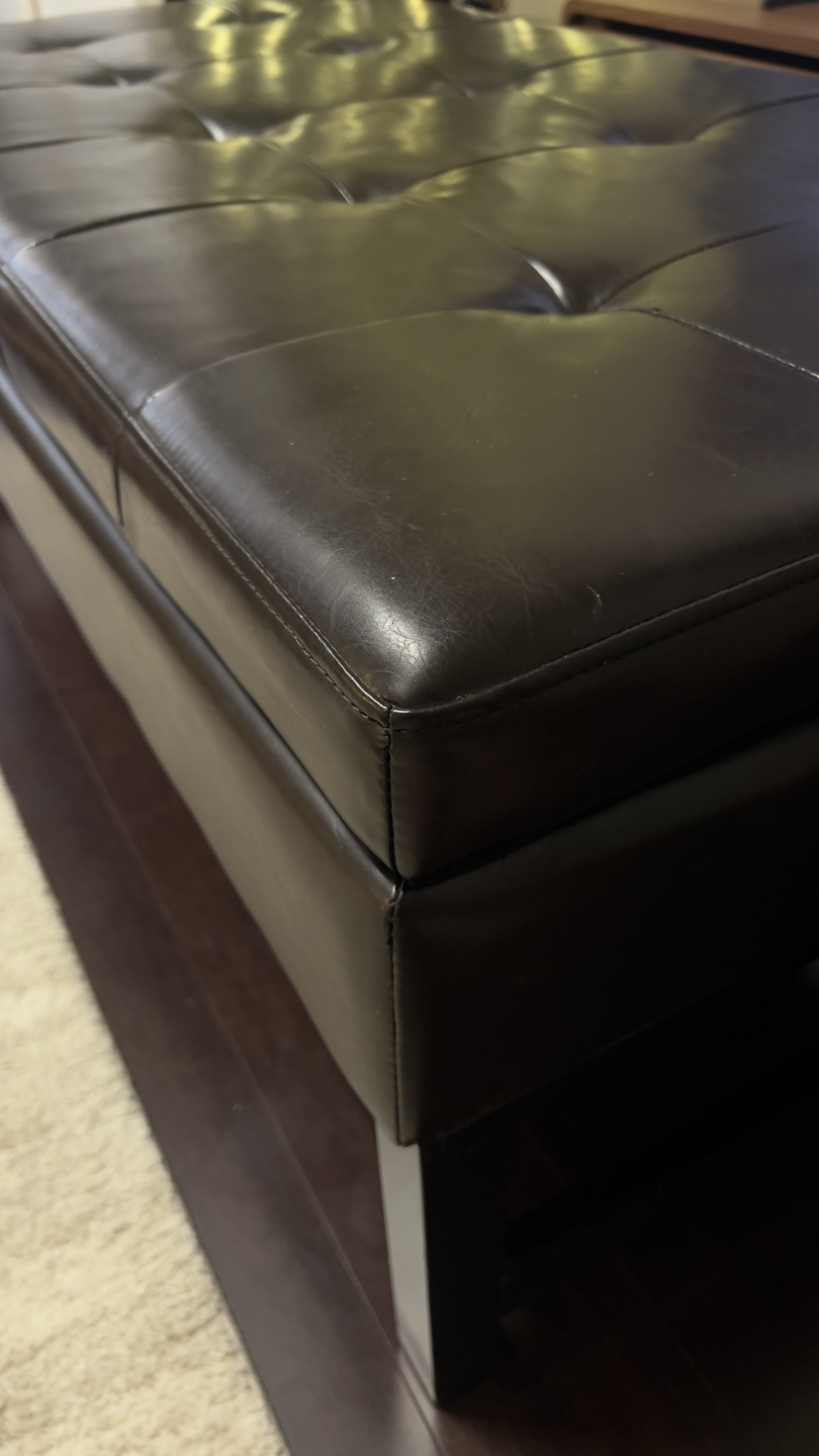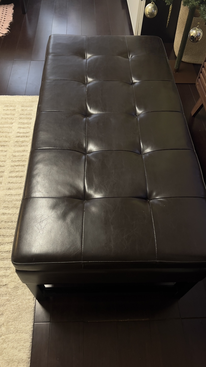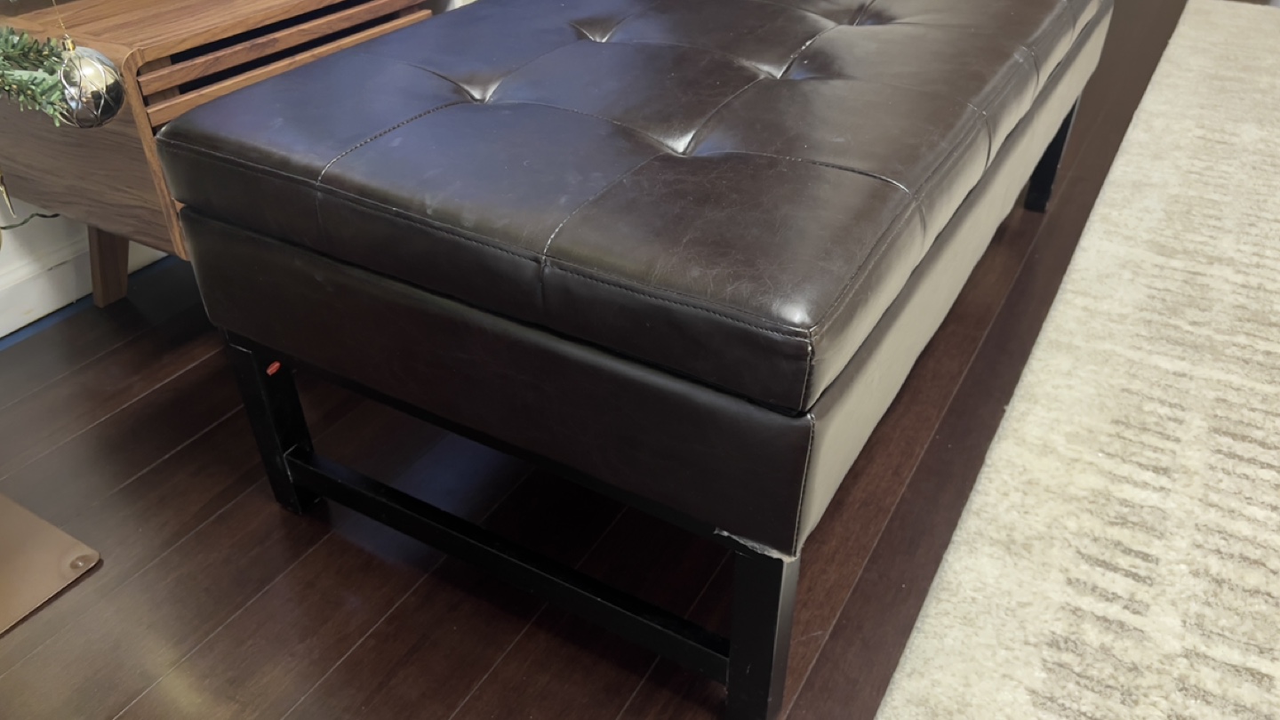 50” Dark brown leather ottoman bench. Storage space inside. Black wooden legs. Button tufted top. Good condition.