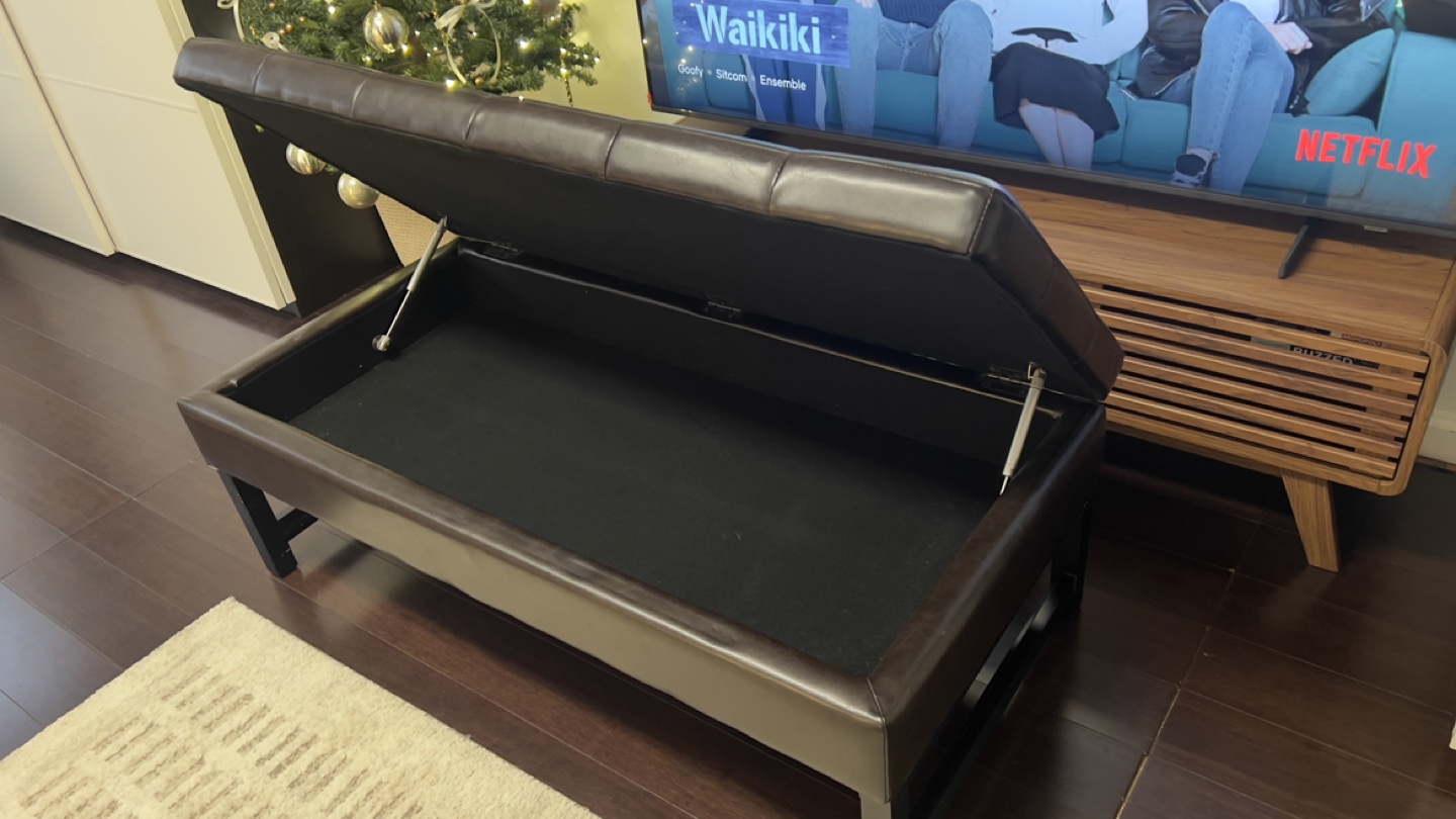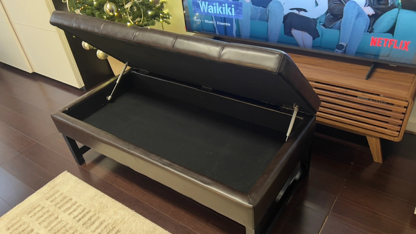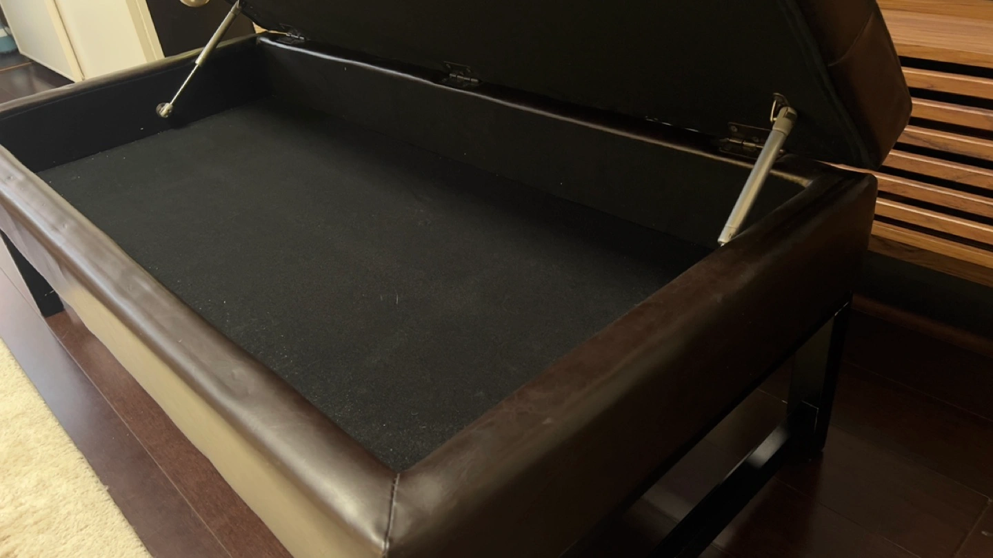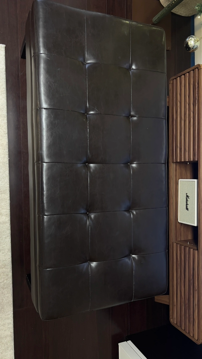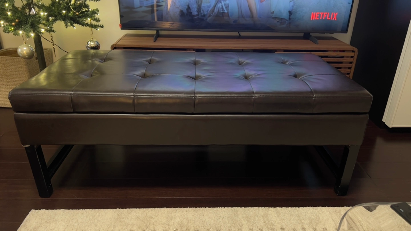 50” Dark brown leather ottoman bench. Storage space inside. Black wooden legs. Button tufted top. Good condition.