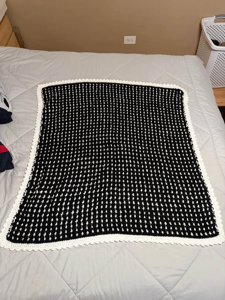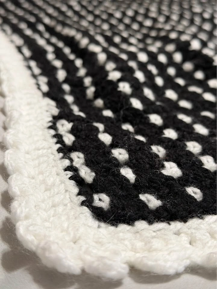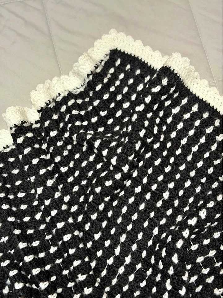 Beautiful handmade crochet blanket in a timeless black and white design with a soft scalloped border. This piece has a modern, minimalist look that works beautifully in living rooms, bedrooms, nurseries, or reading nooks. Perfect as a lap blanket, stroller blanket, cozy chair throw, or thoughtful handmade gift.